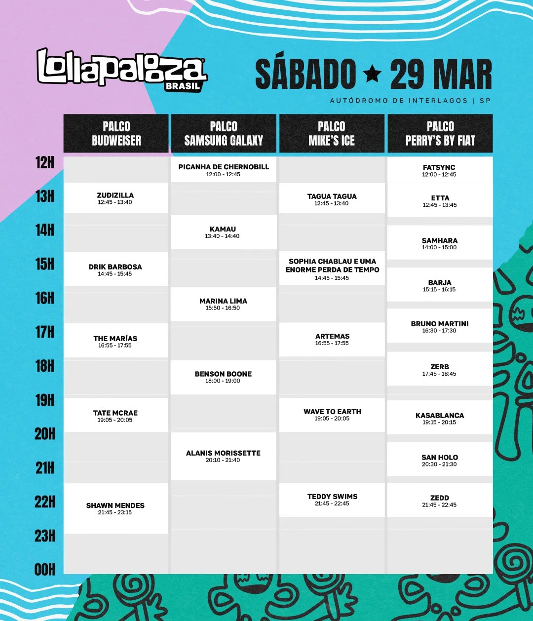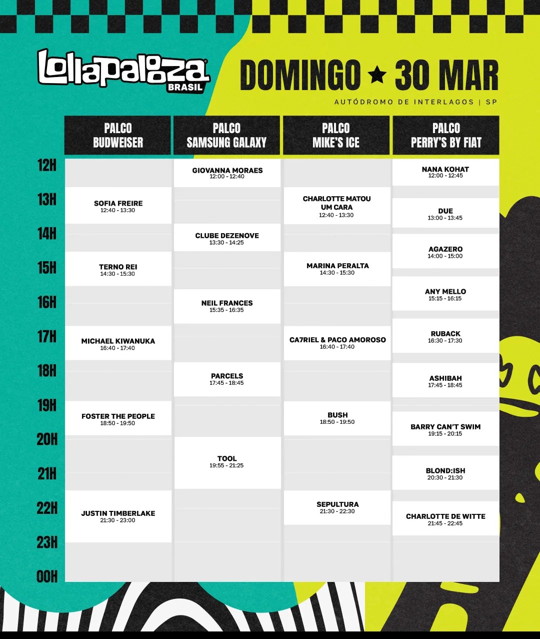 O Lollapalooza Brasil abrirá os portões às 11h a cada dia de evento e já às 12h começam as apresentações. Além das atrações musicais, o festival contará com áreas de descanso, guarda-volumes, estações de água e terminais de recarga cashless.
