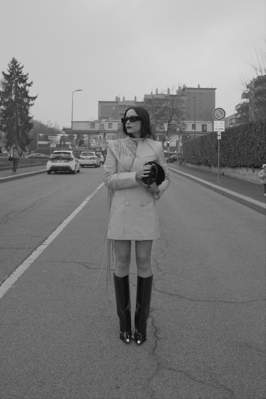No primeiro dia de compromissos, Lu ocupa lugar na front row da Diesel, que apresenta sua coleção de primavera/verão sob direção criativa de Glenn Martens. Para a ocasião, escolhe conjunto de couro com saia e blazer de franjas, combinado a botas e bolsa com acabamento vinílico preto, produção alinhada à estética contemporânea da grife.