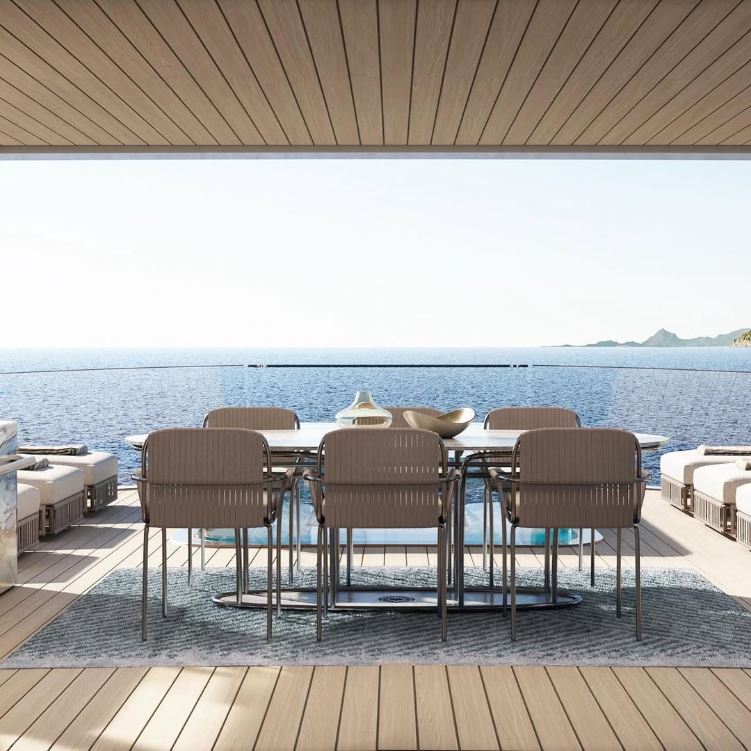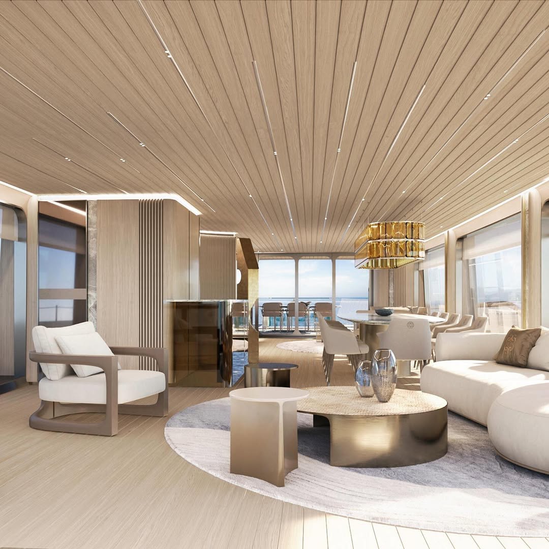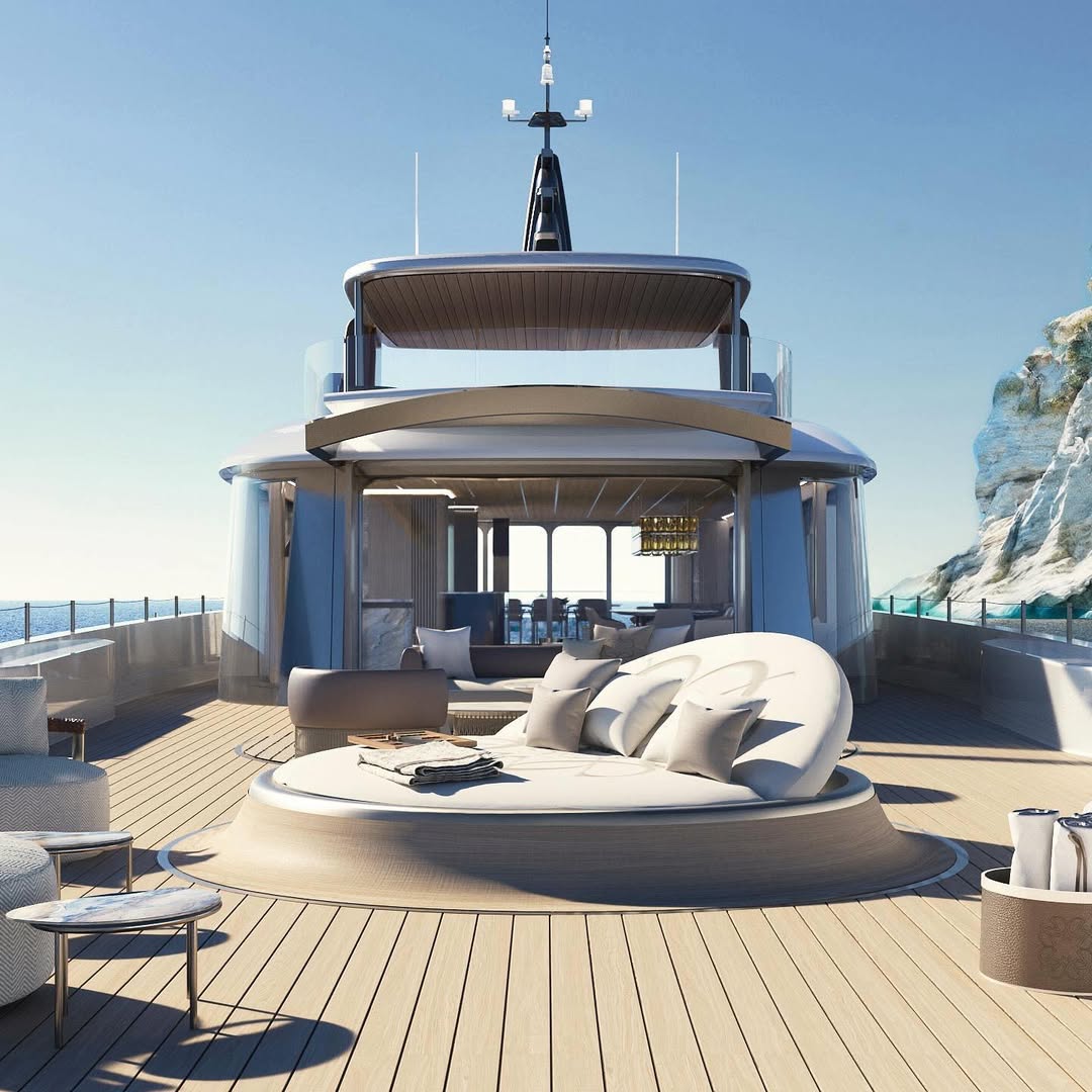 Na popa, a estrela é uma piscina com fundo de vidro, estrategicamente posicionada acima de um bar, oferecendo uma vista surreal — tanto para quem nada quanto para quem brinda. Já na proa, um sofá móvel pode ser reposicionado para aproveitar cada raio de sol.