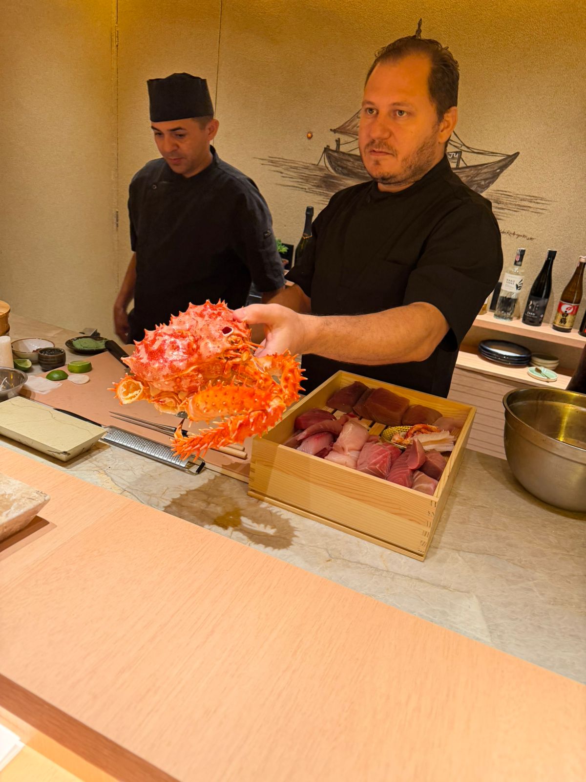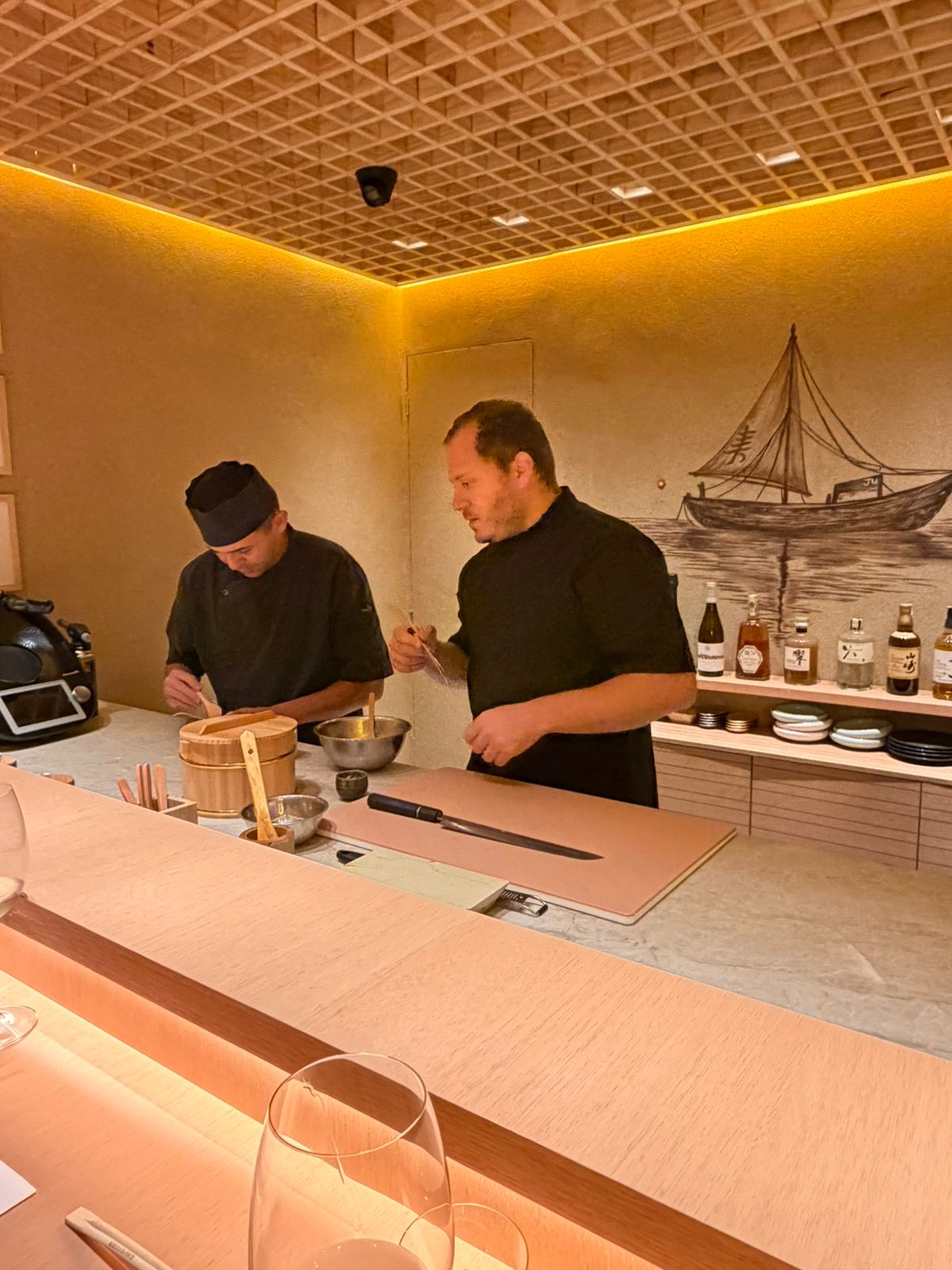 A carta de bebidas reforça esse posicionamento, com seleção que transita entre rótulos internacionais, saquês premium e destilados japoneses como Hibiki e Yamazaki, compondo uma jornada coerente com a proposta da casa.