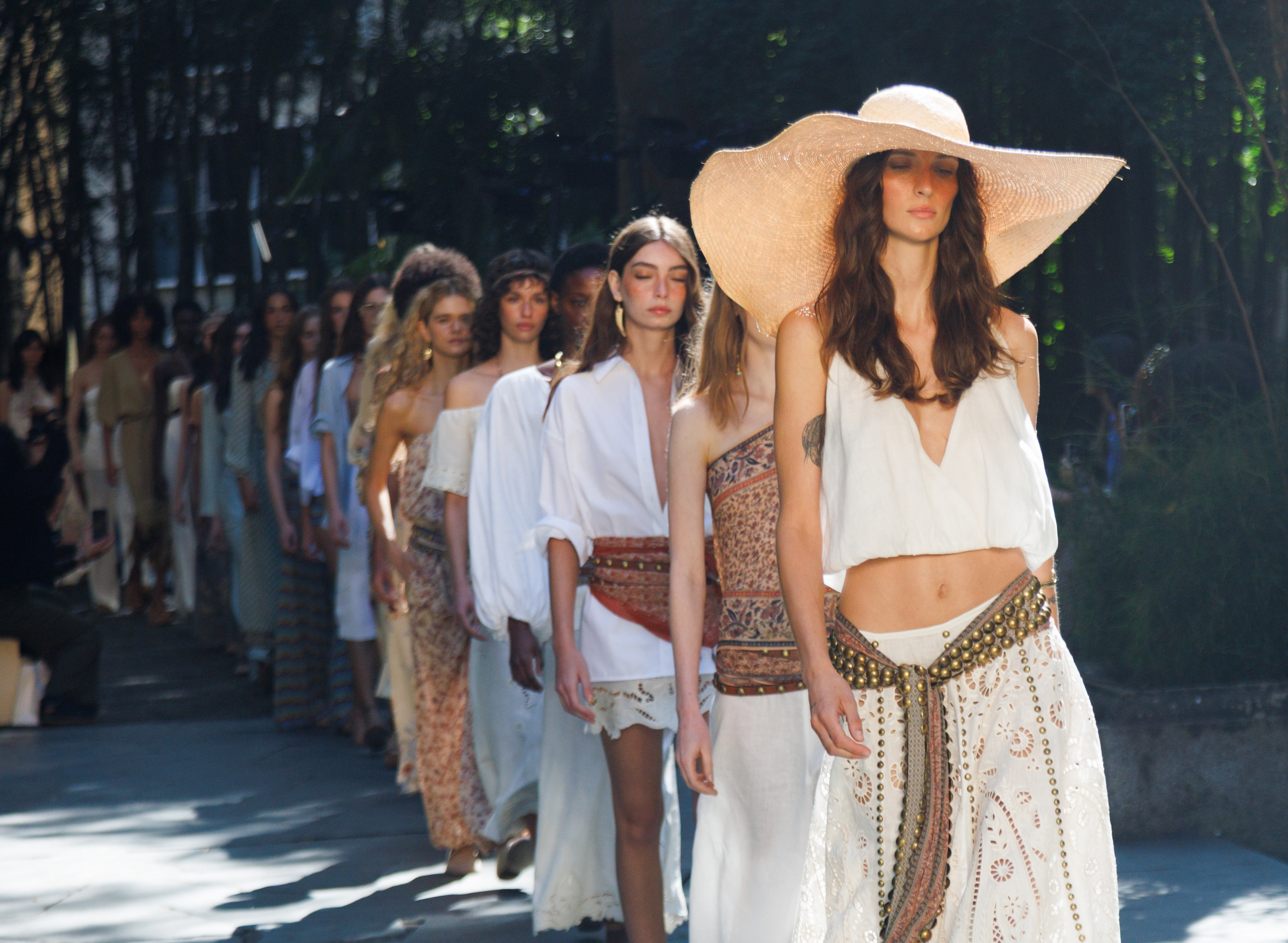 Sob direção criativa de Maria Rita Magalhães Pinto, a coleção traz silhuetas fluidas, com calças aladim, blusas de um ombro só e decotes profundos. Lurex aparece em vestidos festivos e o tule estampado surge com transparência leve e feminina. Lenços, marca registrada da grife, foram destaque no styling: usados como faixa, top ou acessório, reforçaram a versatilidade boho da estação. Acessórios como amuletos em pedra e marfim, pochetes funcionais, sapatilhas de crochê e maxichapéus de palha completaram o mood solar e descontraído do desfile.