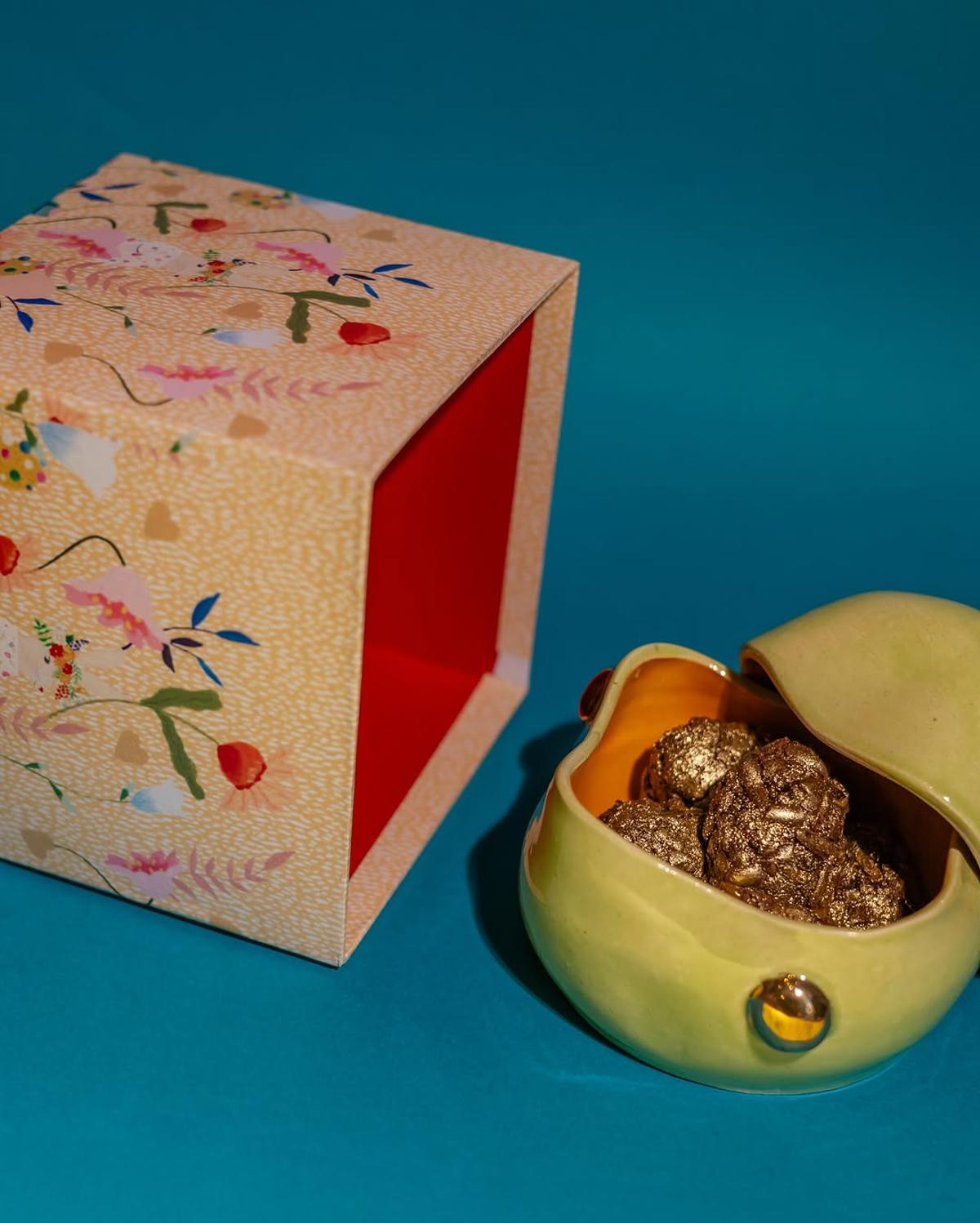Em edição limitada e desenvolvida em parceria com a Affetto Cucina, a linha une cerâmica e confeitaria artesanal em composições sensoriais que incluem chocolates e velas artesanais. Os elementos naturais — cor, textura, aroma — se encontram com o design intuitivo de Nádia, criando peças que celebram o recomeço com beleza e verdade.