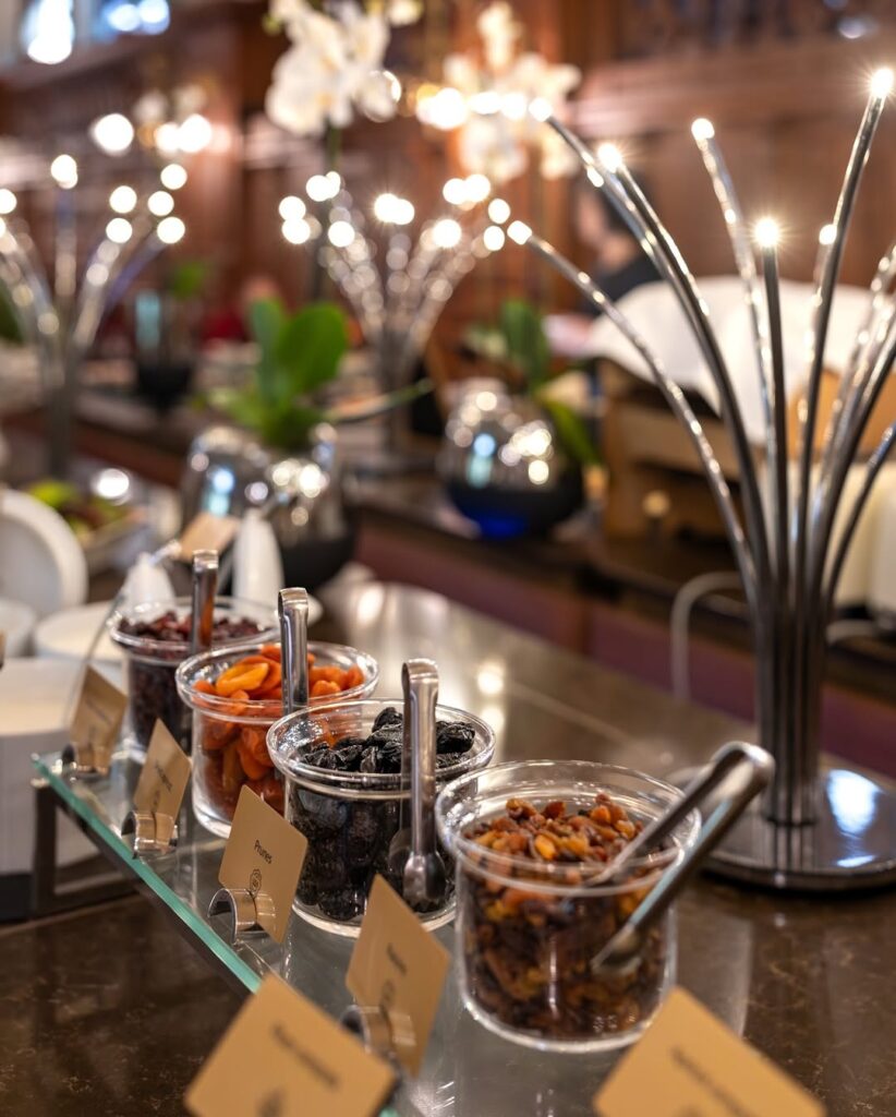 Para acompanhar as refeições, o cardápio de sobremesas também segue a tradição da época imperial, trazendo delícias como um bolo de camadas finas coberto por caramelo crocante chamado Dobos e o Bolo Eszterházy (com nozes e creme amanteigado).