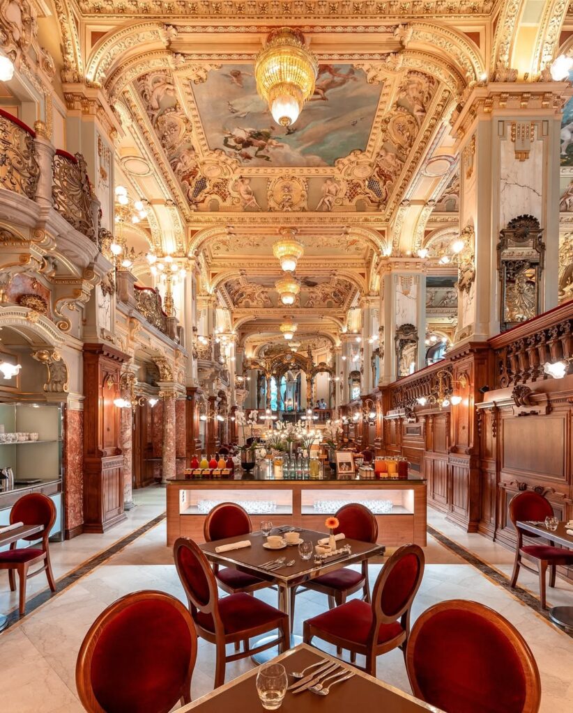 A riqueza arquitetônica faz com que cada canto do café pareça uma obra de arte, tornando-o um dos lugares mais fotografados de Budapeste.