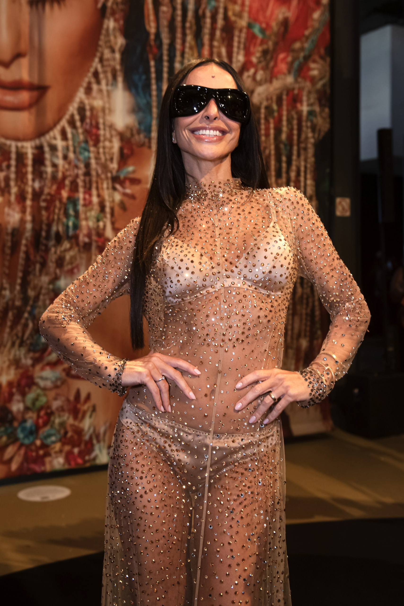Sempre associada à construção de imagem e presença, Sabrina Sato marcou o quarto dia da Rio Fashion Week com um visual que reforça sua identidade no universo da moda: um vestido transparente cravejado, sobreposto a um conjunto de lingerie em tom próximo à pele, apresentado na Exposição de Alta Costura do Carnaval, no Píer Mauá, no Rio de Janeiro.