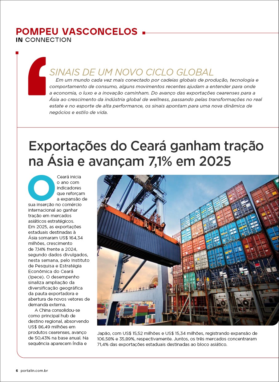 Logo na abertura, a coluna IN Connection, assinada pelo publisher Pompeu Vasconcelos, analisa sinais de transformação que atravessam diferentes setores da economia. A coluna conecta temas como real estate, consumo premium, economia global e comportamento, oferecendo uma leitura antecipada de tendências que já começam a redesenhar mercados e dinâmicas de poder econômico.