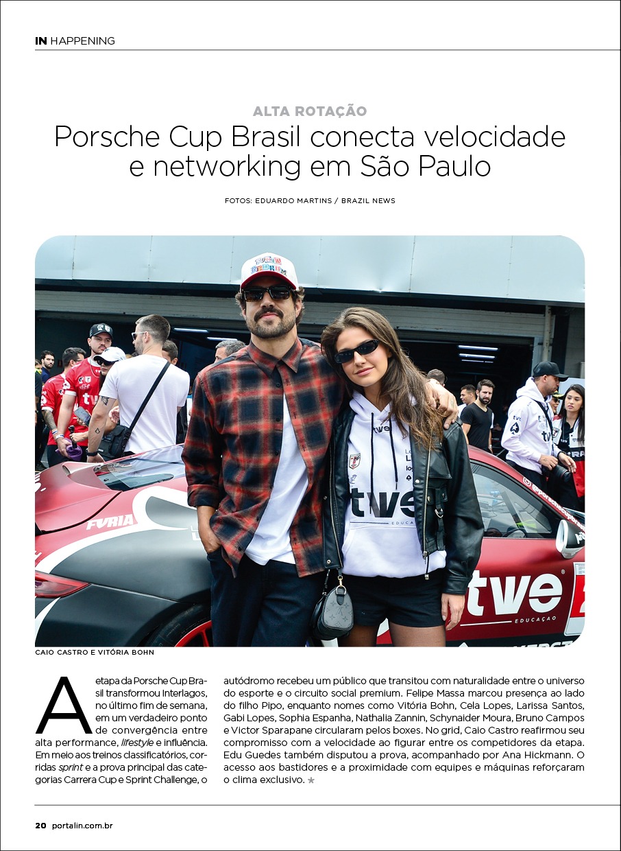 Outro eixo da publicação registra encontros que traduzem a dinâmica social do circuito premium. Eventos intimistas e encontros estratégicos reúnem nomes influentes do mercado financeiro e empresarial, enquanto o universo do esporte de alta performance também aparece em destaque com a etapa da Porsche Cup Brasil, que transformou o autódromo de Interlagos em um ponto de convergência entre velocidade, networking e lifestyle.