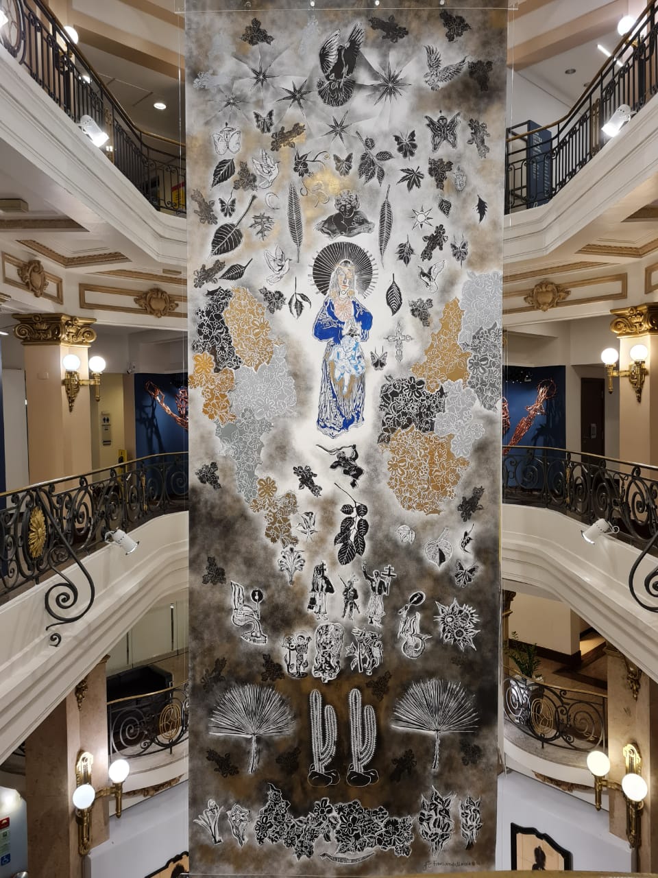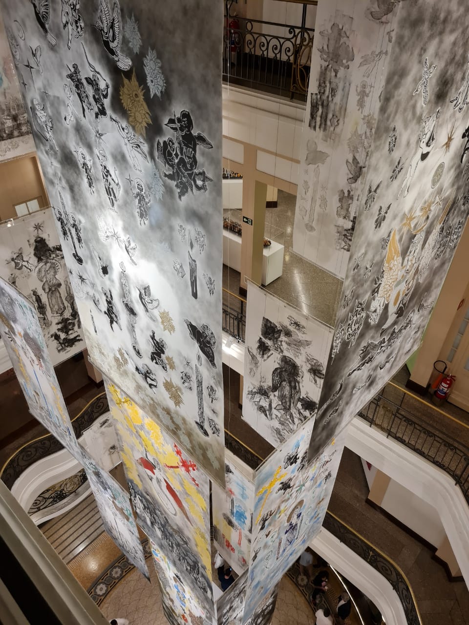 Representado em Fortaleza pela Galeria Leonardo Leal, o artista levou 18 de seus trabalhos que desenvolveu usando a técnica de xilogravura, em uma instalação suspensa com rolos de papel de até 20 metros de altura.