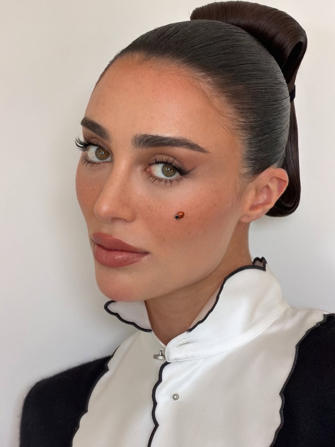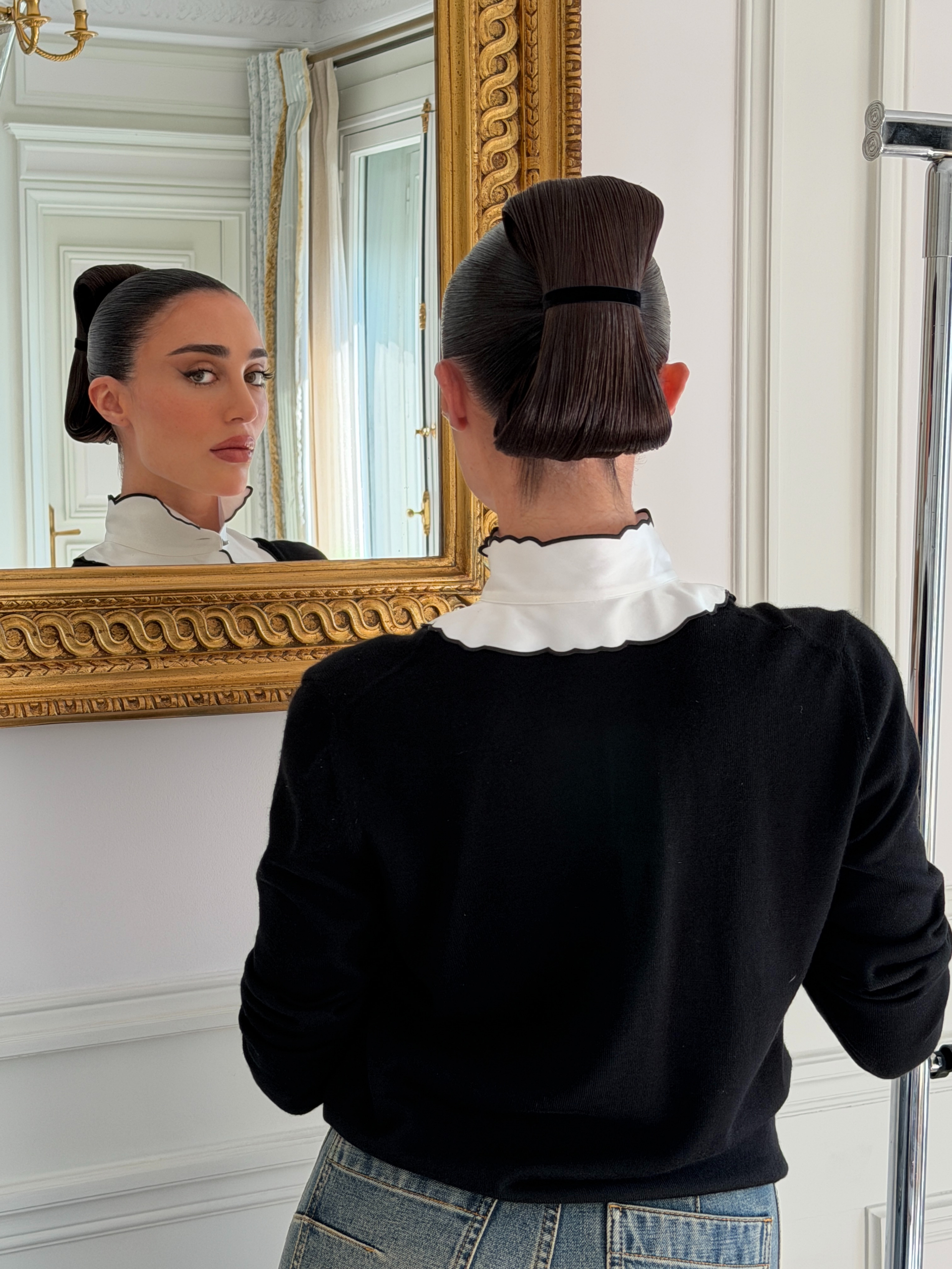 Para assistir à apresentação, ela apostou em uma produção de linhas elegantes e contemporâneas. O look combinou camisa branca de gola alta com babados frontais sob tricô preto ajustado, finalizado por jeans de cintura alta e modelagem ampla. O styling ganhou força com cinto de fivela marcante e sapatos de bico fino, enquanto a beleza apostou em coque polido e maquiagem sofisticada.