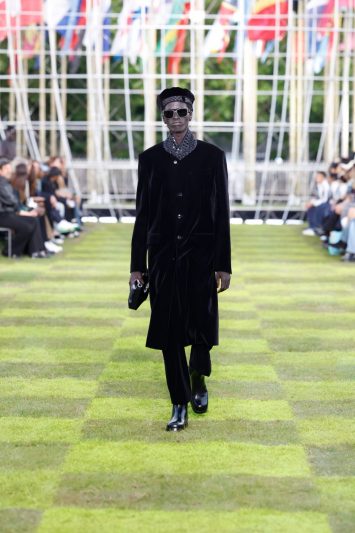 Ao som de sua própria criação musical, “Triumphus Cosmos”, Pharrell conduziu 81 modelos de diversas origens pela passarela, celebrando a diversidade e o talento global. Colaborações com o coletivo Air Afrique enriqueceram a apresentação, destacando estampas que homenageiam uniformes esportivos africanos e promovem a cultura do continente.