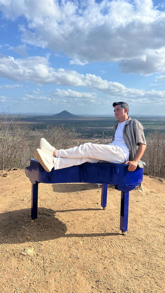 Pianista Paulo Rodrigo leva seu piano azul ao topo do Serrote de Ocara em novo clipe