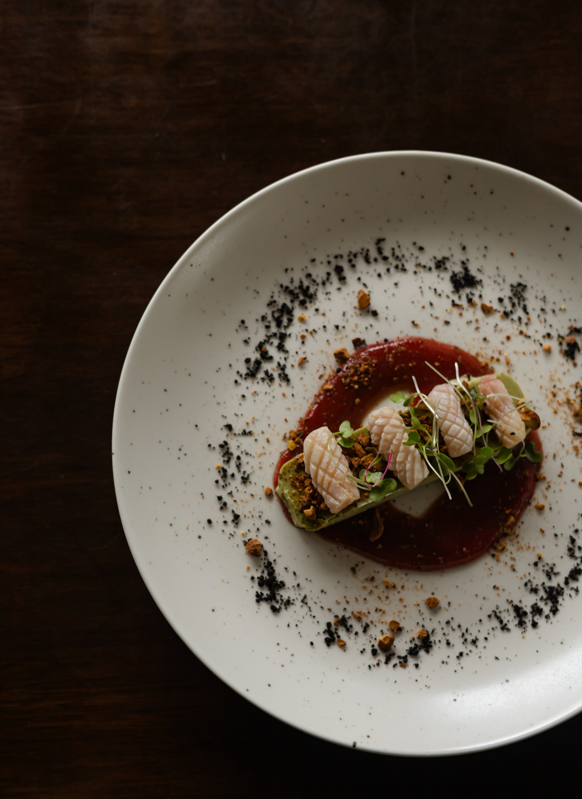 - Mousse de pistache, coulis de tomate e framboesa, finalizado com lula salteada e pistache picado
