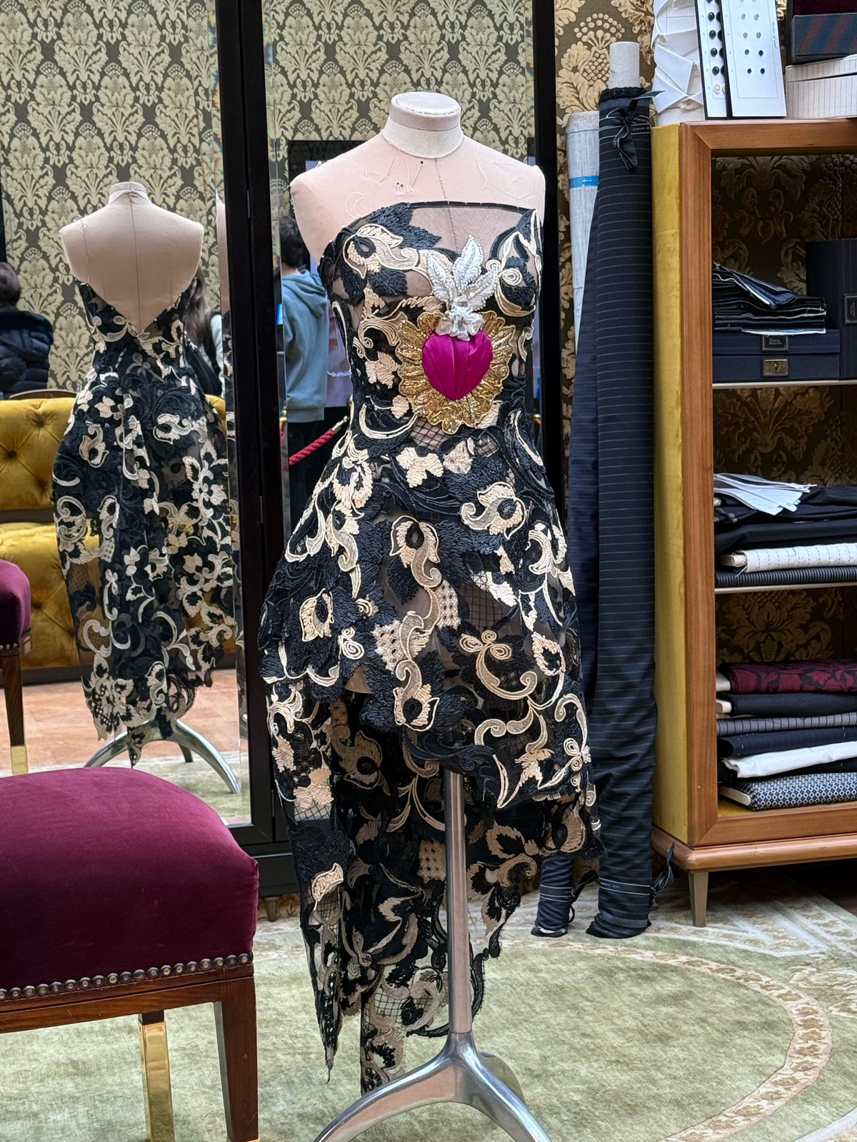Com a curadoria da historiadora de moda Florence Müller, a exposição reúne mais de 200 peças exclusivas de Alta Moda e Alta Joalheria, incluindo criações inéditas. Destaque para os bordados meticulosos, rendas sofisticadas, tecidos preciosos e detalhes artesanais, que reafirmam o compromisso da marca com o tradicional “fatto a mano”.