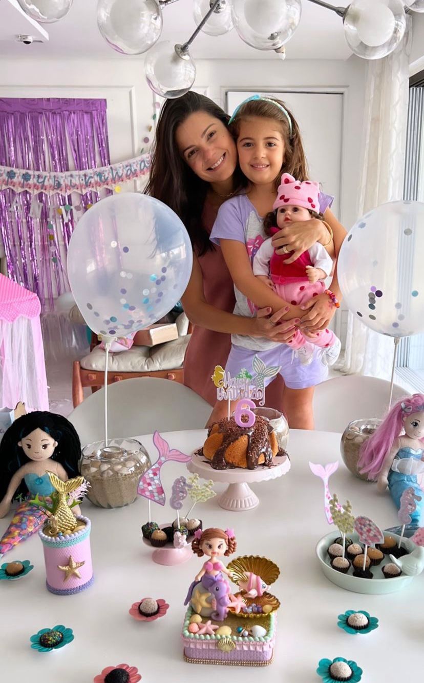 Em tons de roxo e com tema envolvendo o universo das sereias, a sessão parabéns teve direito a bolo, docinhos e balões coloridos, além da presença de Rafaela e Tereza Távora.