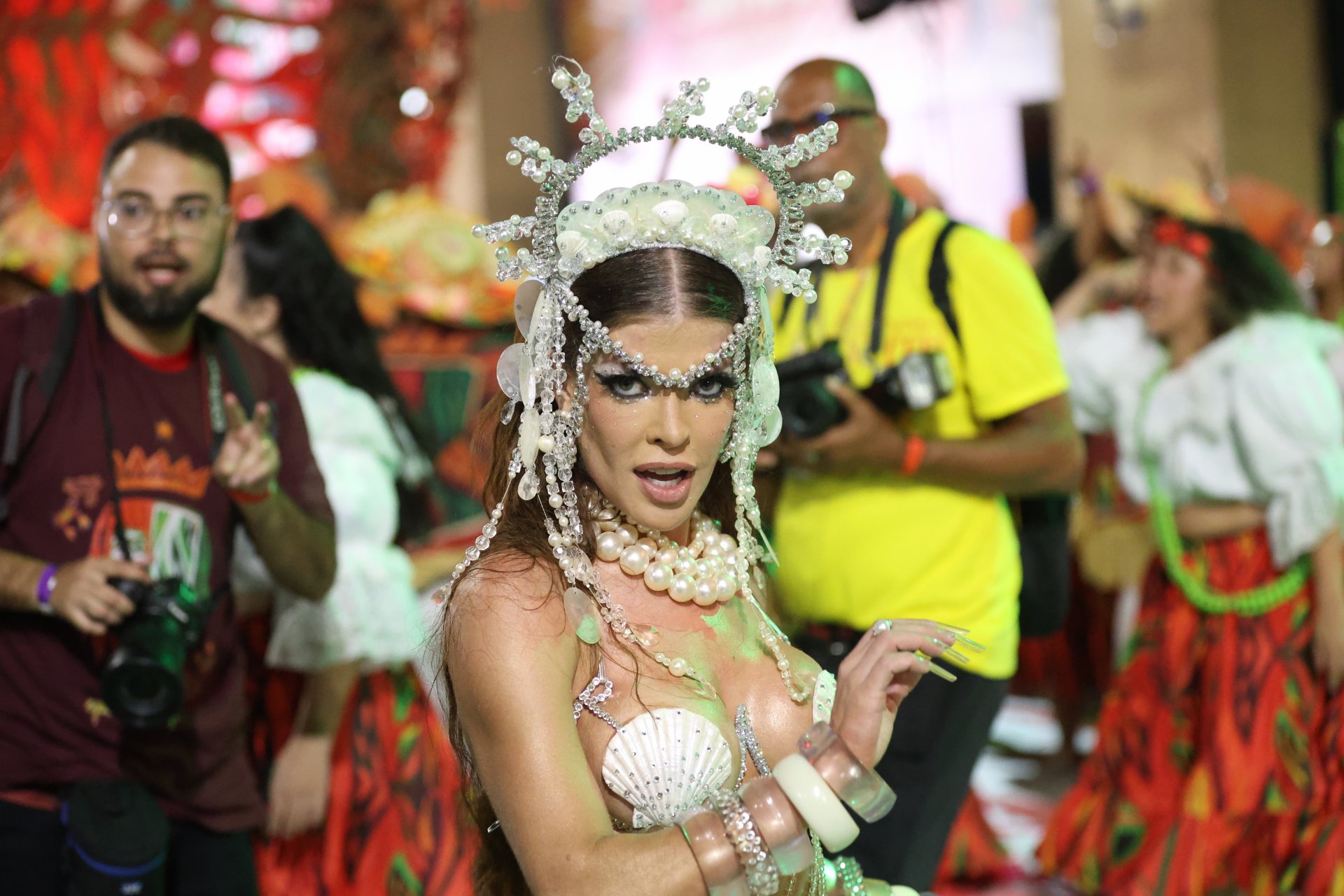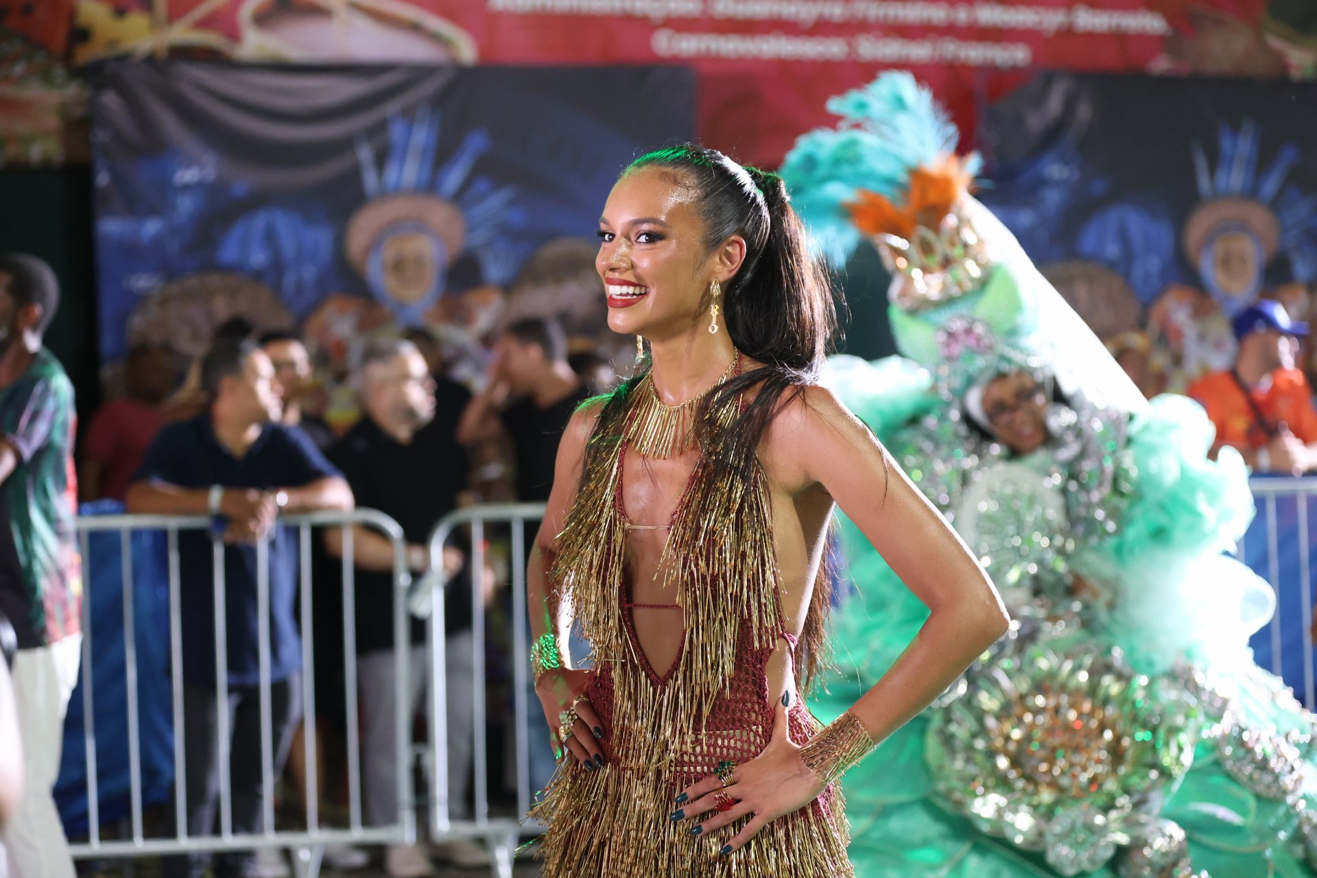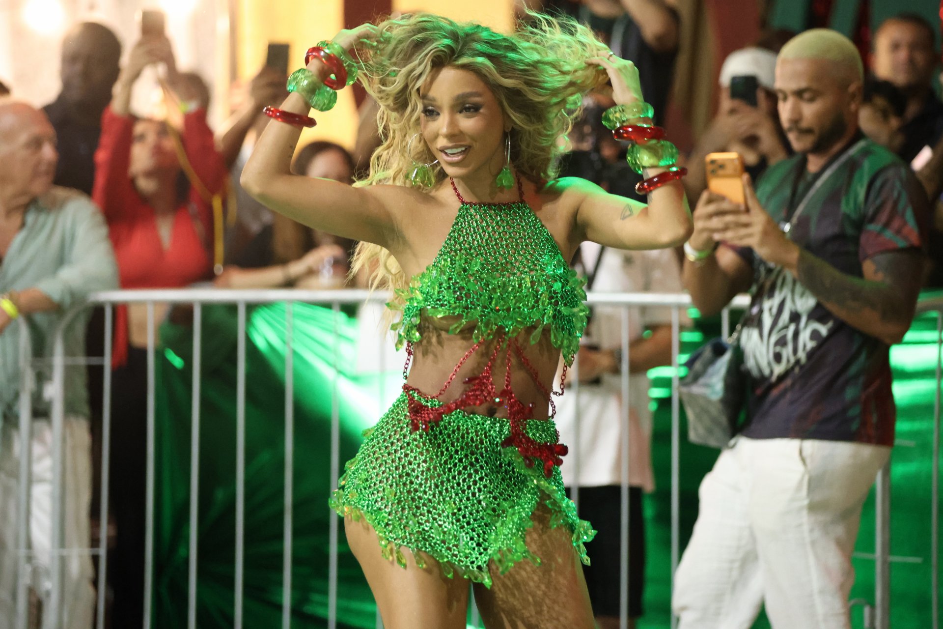 Brunna Gonçalves apostou em pedrarias e transparências, com maxi braceletes e cabelo volumoso reforçando a vibração moderna. Tati Minerato homenageou o mangue com mini caranguejos e cristais, aprofundando o mergulho estético no enredo.