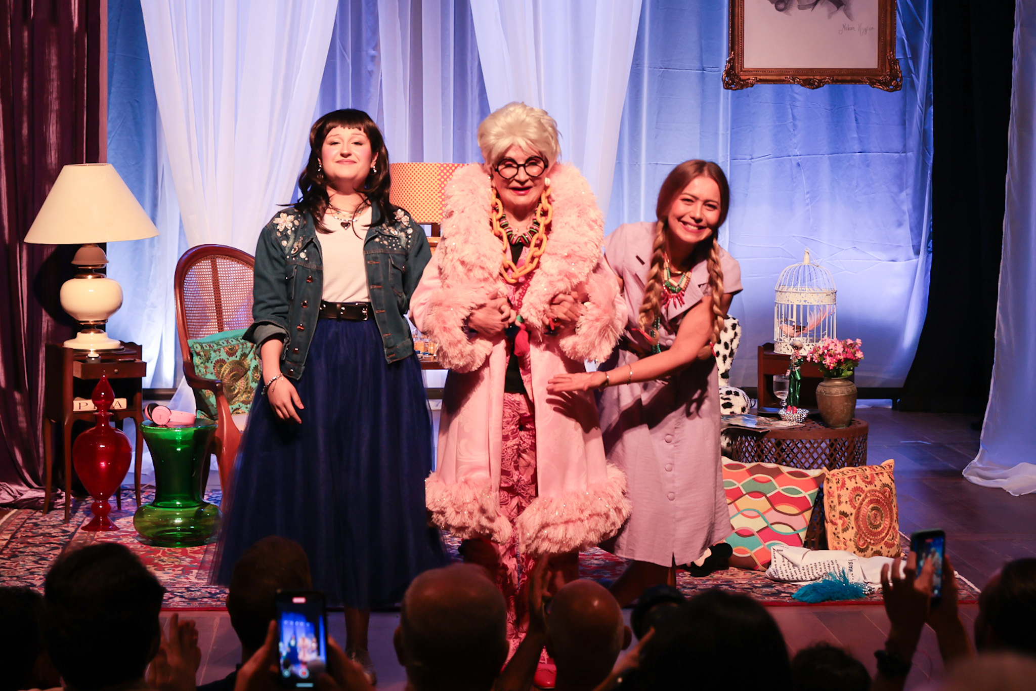 O espetáculo também marca um encontro especial entre gerações. Rosamaria divide o palco com a neta Sofia Mendonça, que interpreta Emily, jovem jornalista encarregada de entrevistar Iris para a revista Vogue. O diálogo entre as personagens evolui de uma entrevista formal para uma conversa repleta de humor e reflexões sobre etarismo, identidade, escolhas e legado.