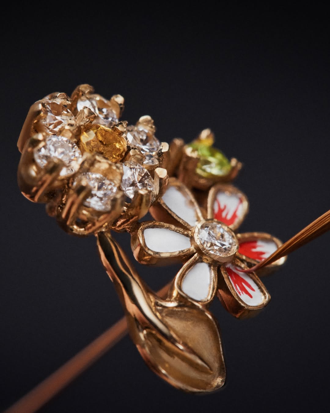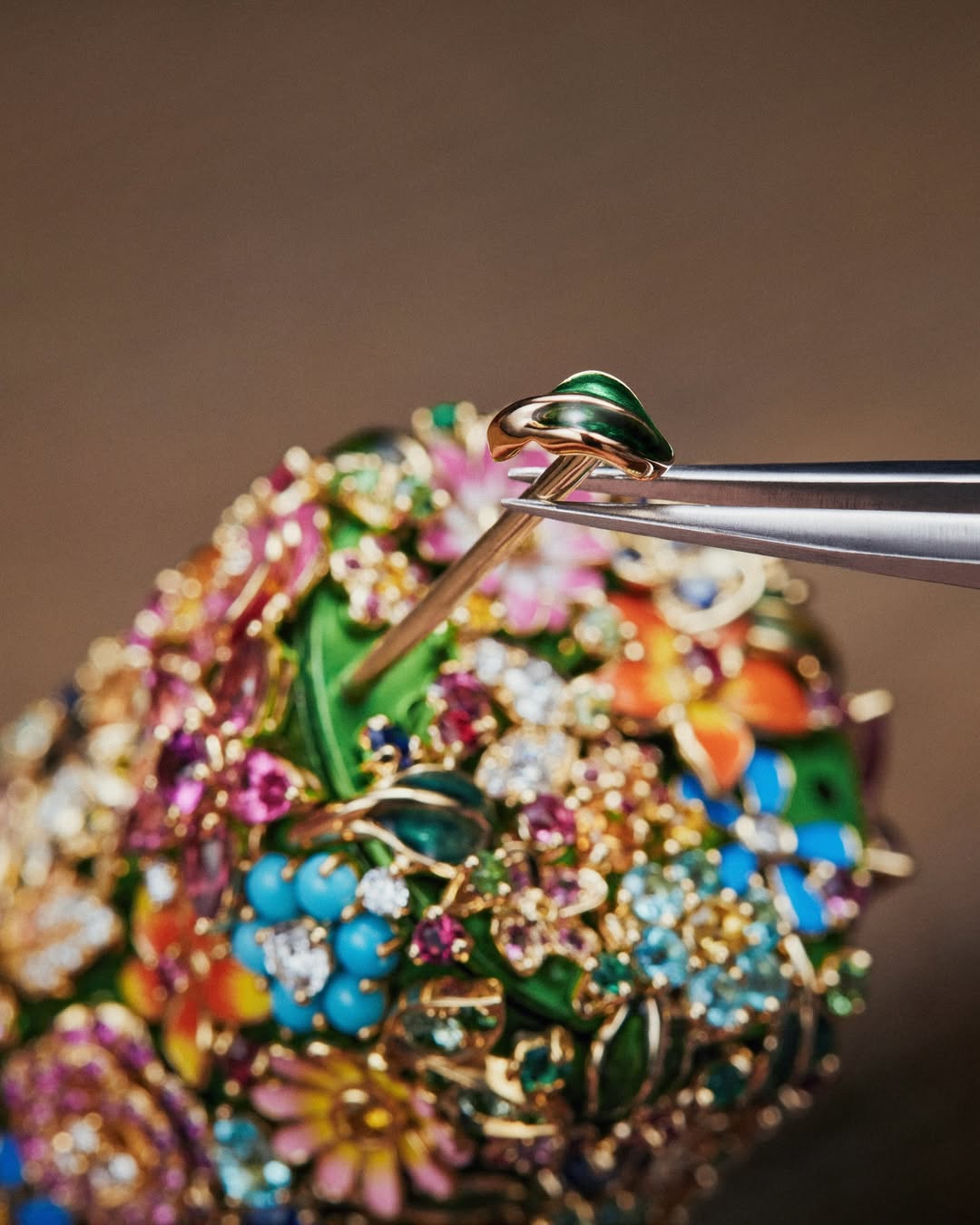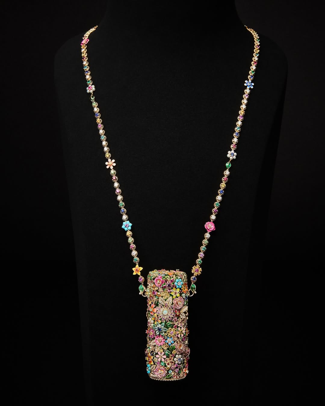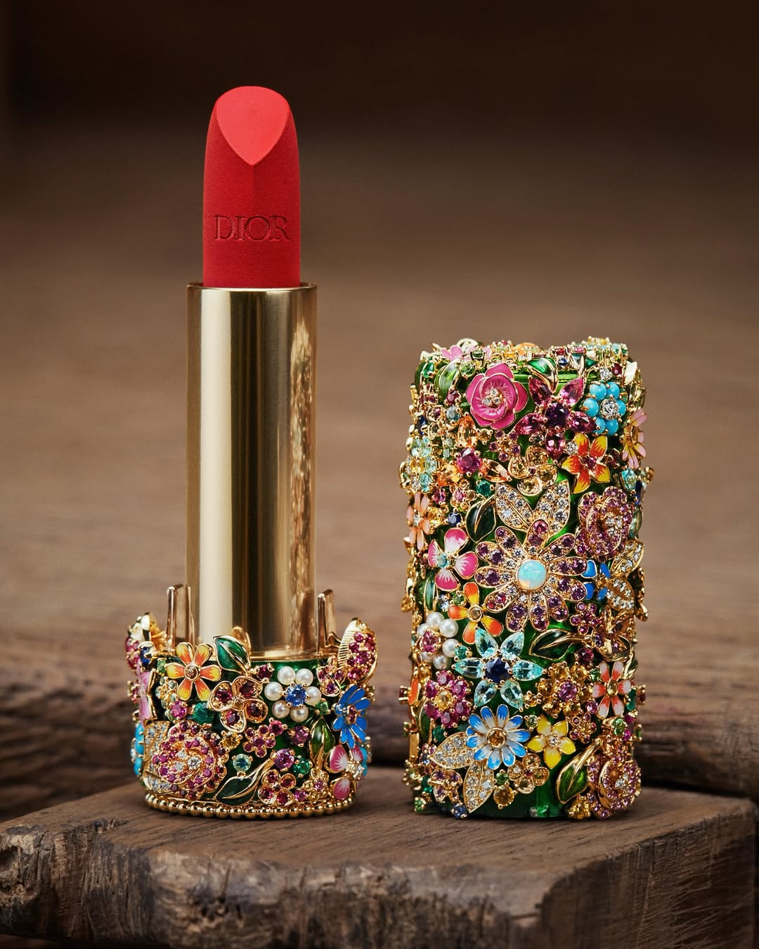 Juntos, eles criaram um objeto que é, ao mesmo tempo, sofisticado e sensorial. O batom vem em uma embalagem esculpida como se fosse um relicário, decorada com flores, insetos e pedras preciosas como turmalinas paraíba, opalas e turquesas, todas aplicadas manualmente. O verniz, aplicado em camadas, produz efeitos de luz hipnotizantes, tornando cada unidade única — e visualmente deslumbrante.