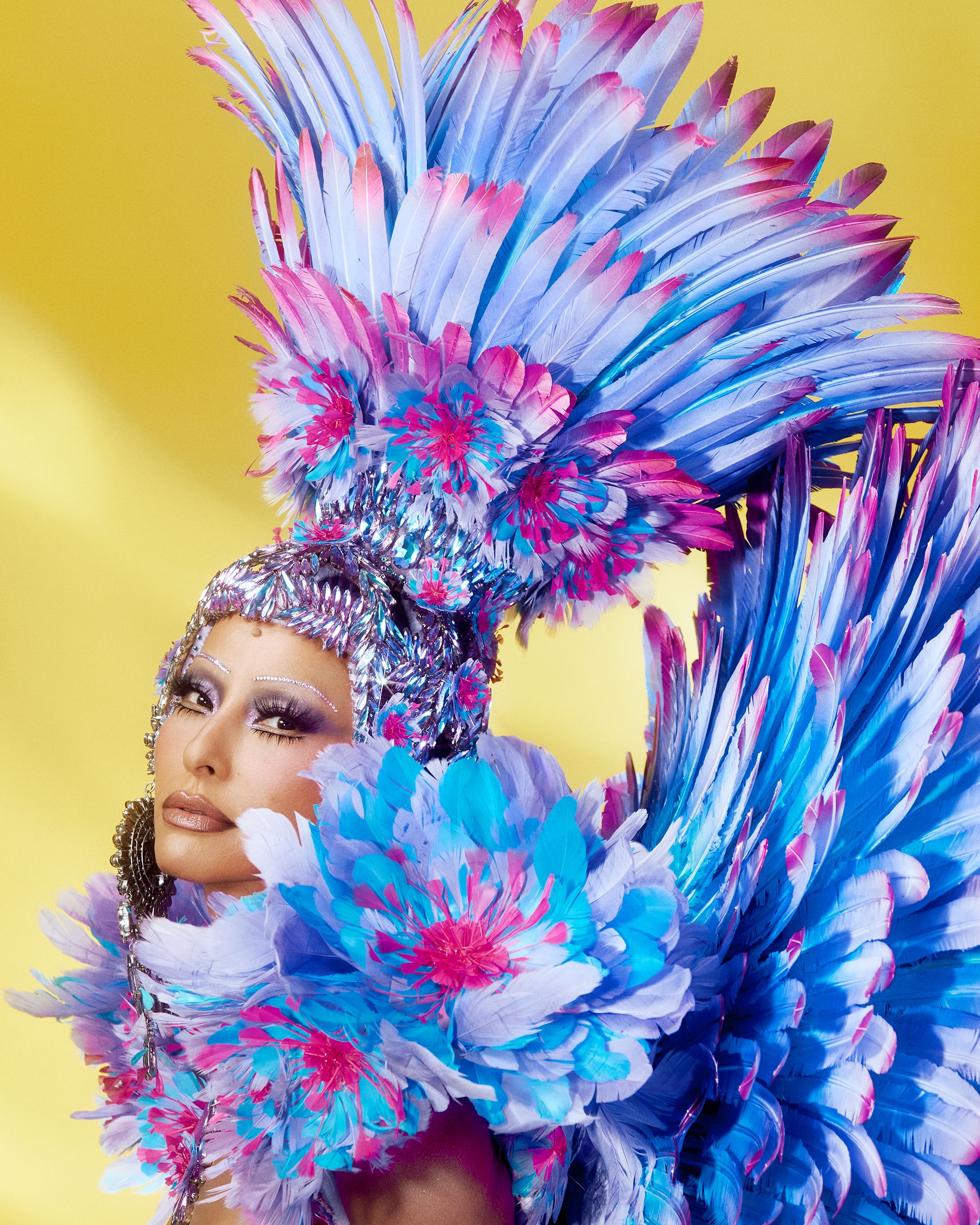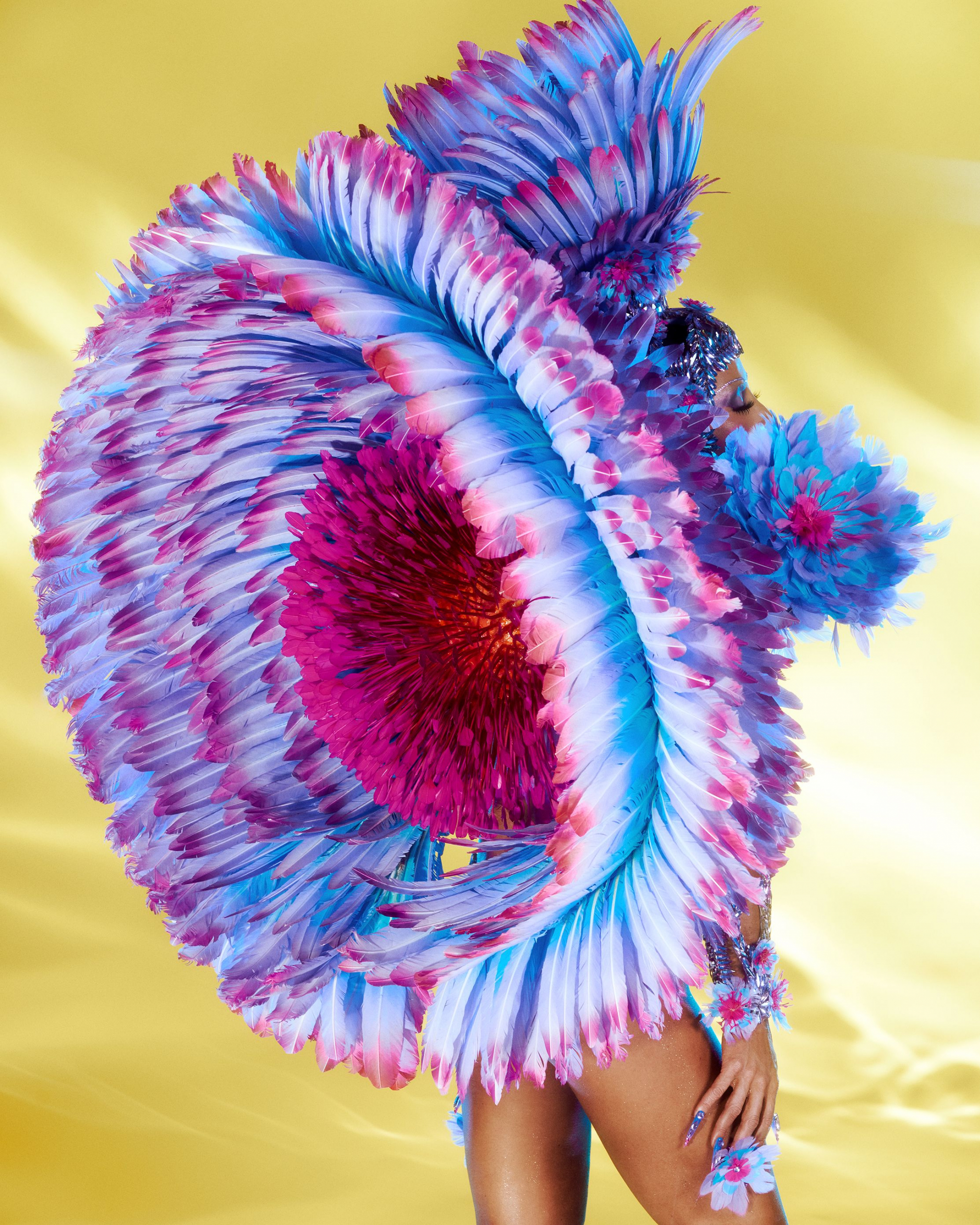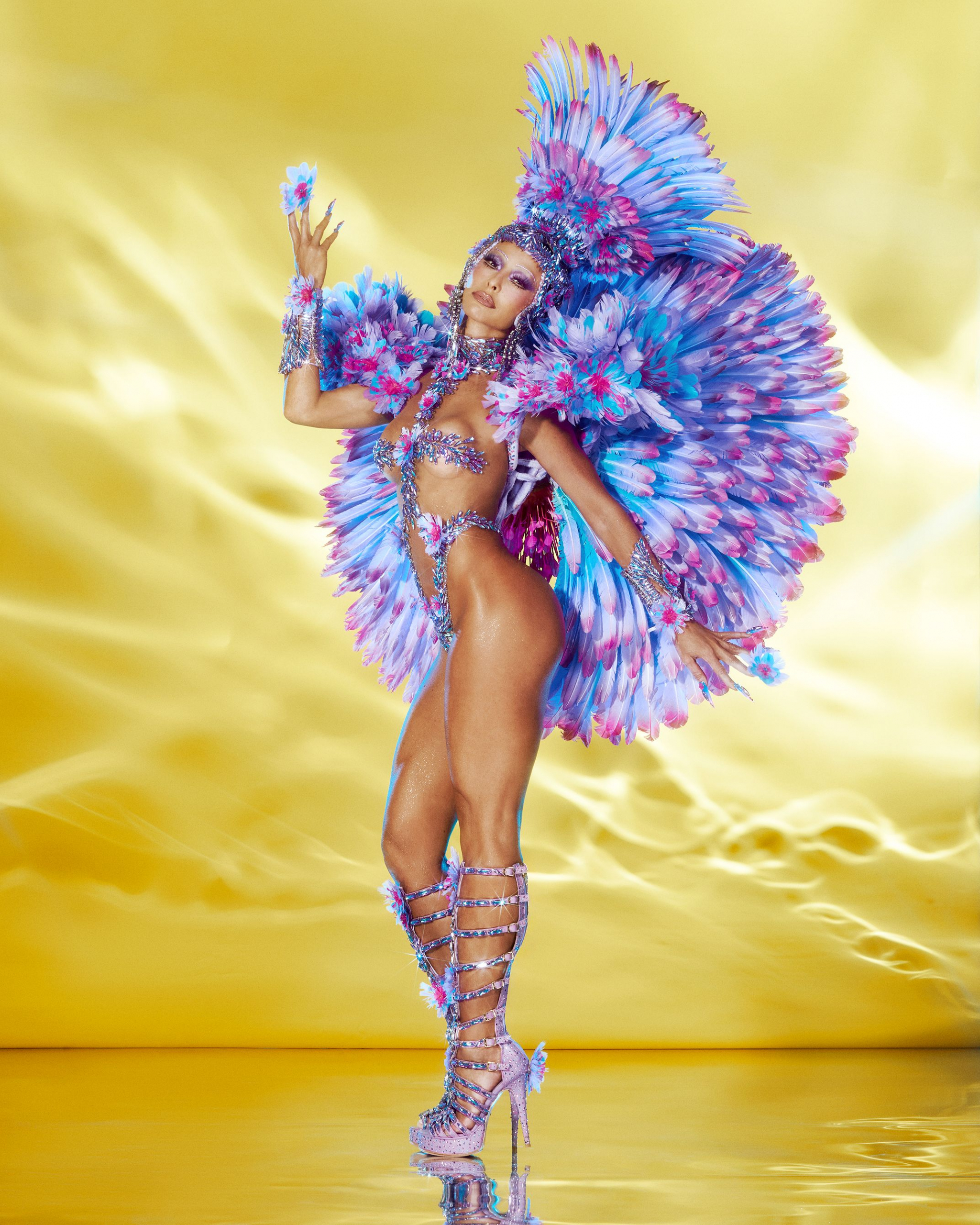 O modelo apostou no efeito “dripping”, como se joias líquidas escorressem pelo corpo, destacando cada curva com precisão. As amarrações delicadas reforçaram a silhueta, enquanto o manto azul profundo, volumoso e dramático, trouxe movimento e contraste ao brilho prateado das pedrarias. A beleza seguiu o mesmo conceito reluzente, com máscara e headpiece cobertos de cristais, cílios ultra alongados e pele glossy.