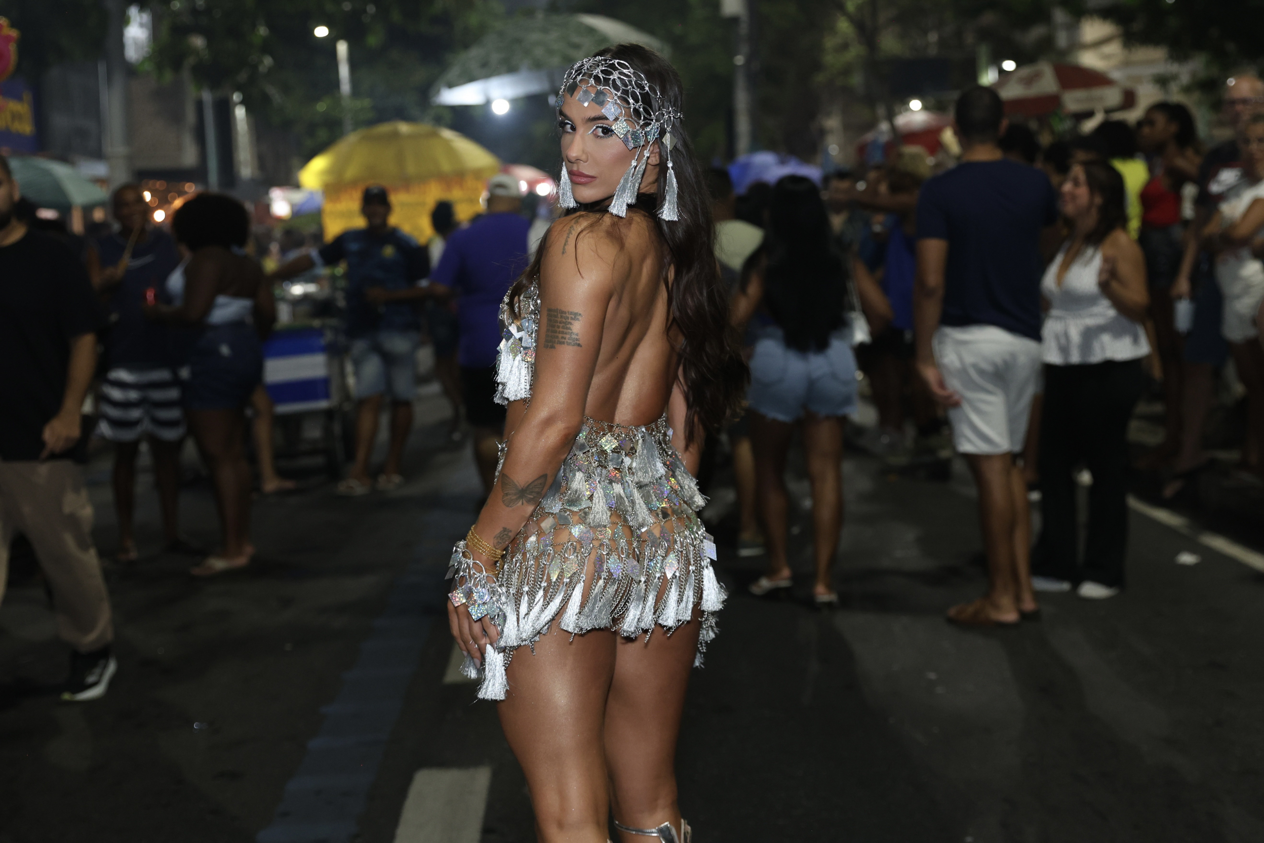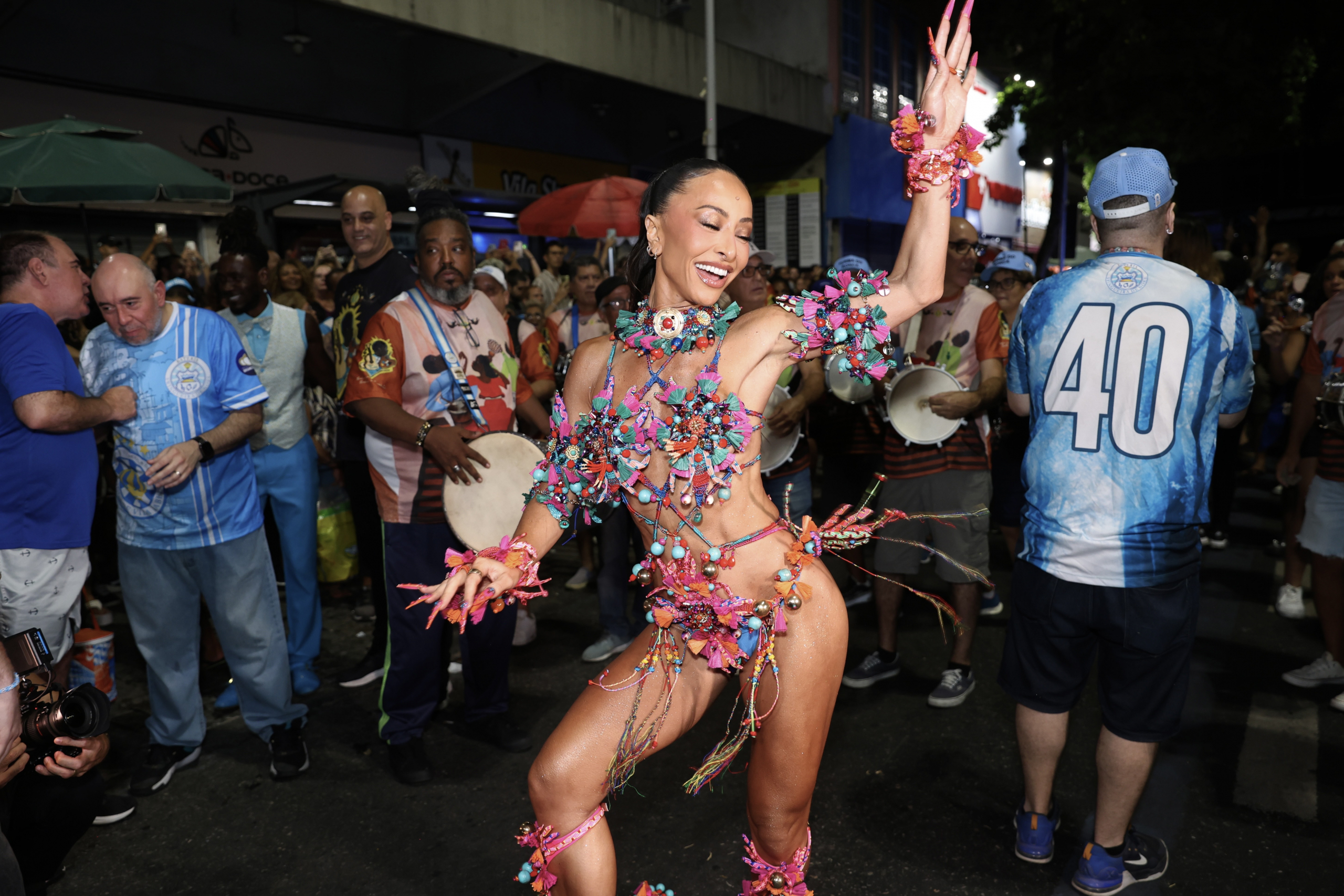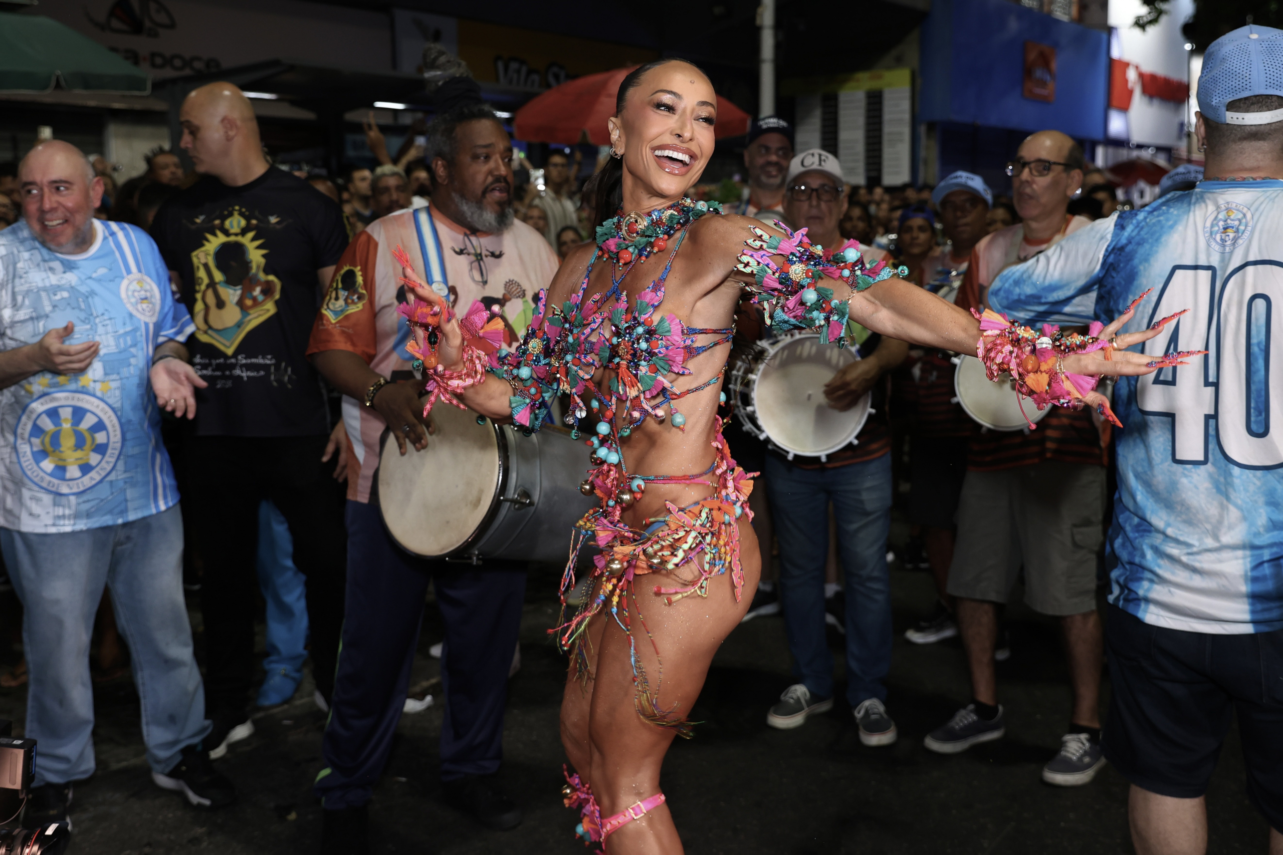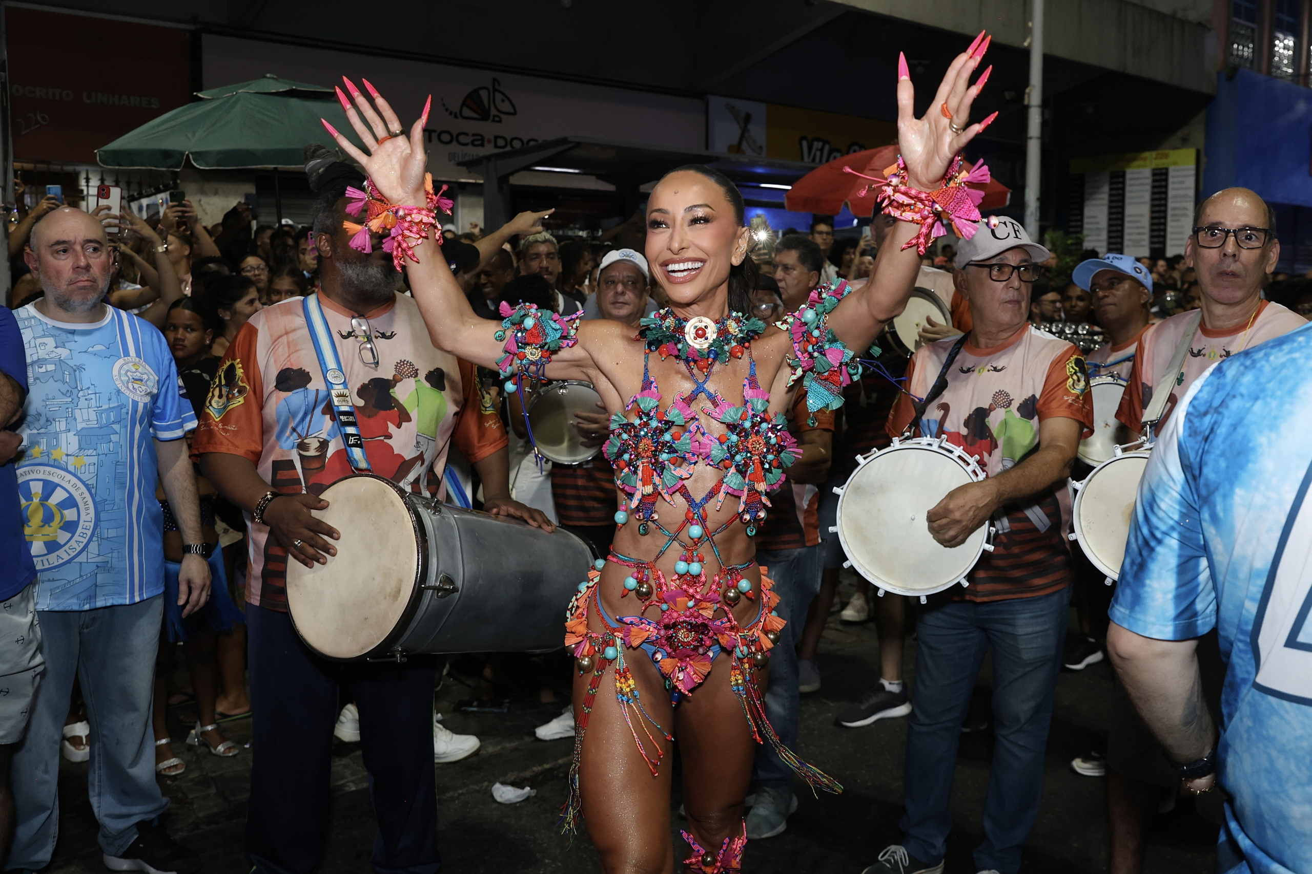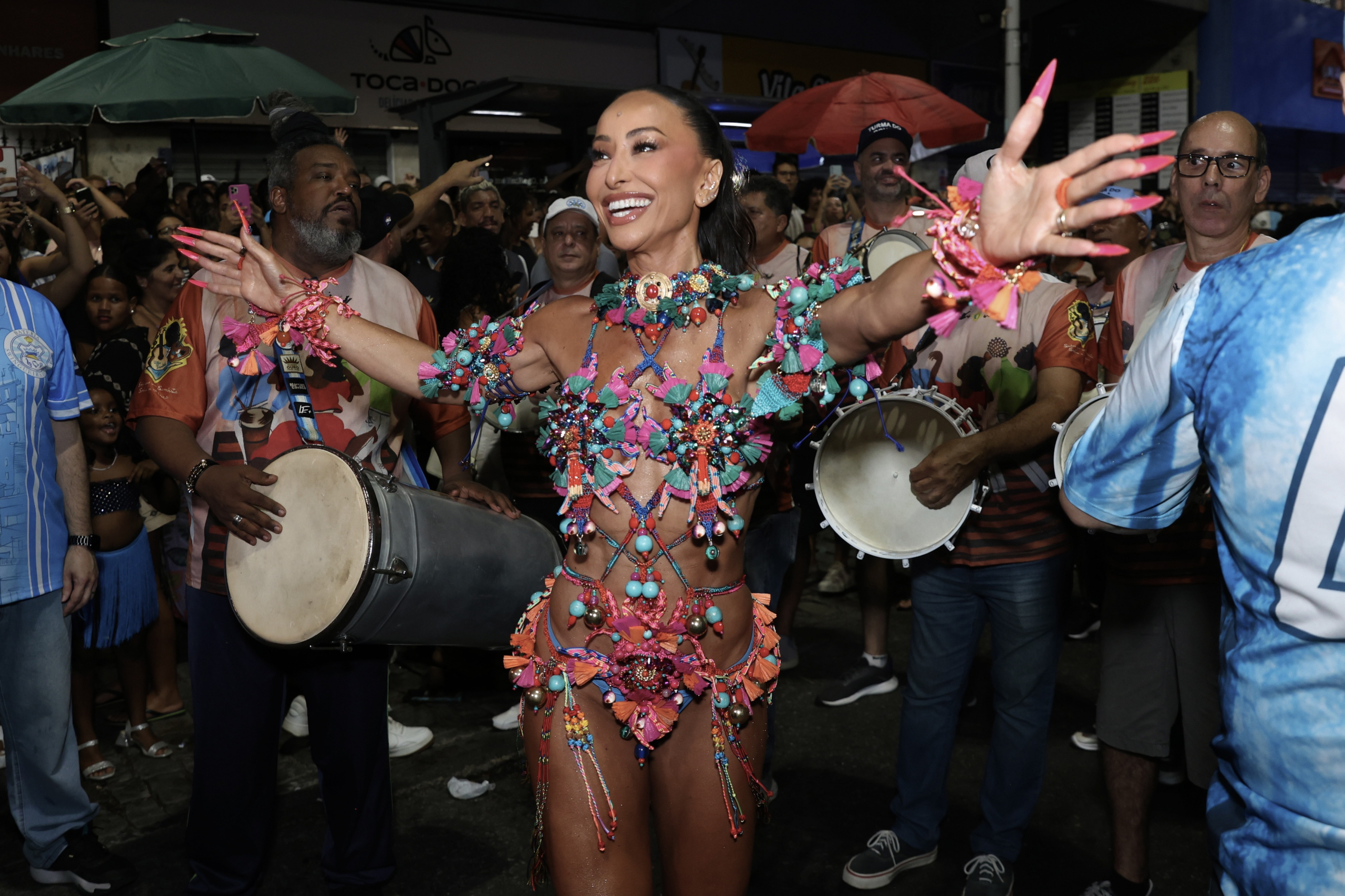 Para a ocasião, Sabrina apostou em um visual multicolorido, com pedrarias, miçangas, penas e recortes de tecidos que transformavam o corpo em movimento em uma verdadeira pintura viva. O styling exuberante, combinado a salto pink e unhas decoradas em proposta maximalista, reforçou sua identidade fashion no Carnaval e arrancou aplausos a cada giro.
