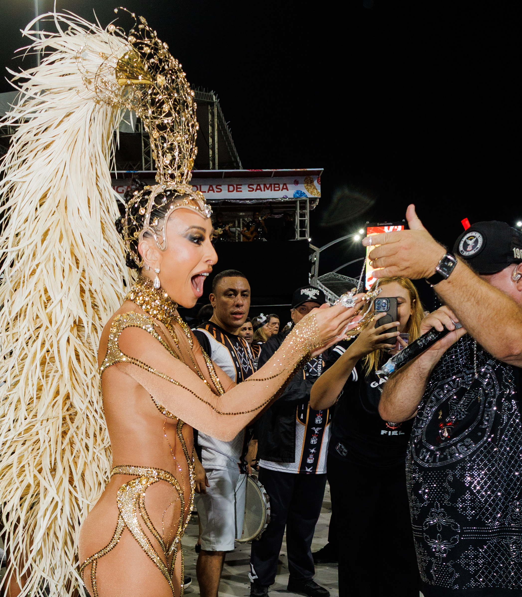 Outro momento de destaque veio com Erika Schneider, que surgiu em fantasia com transparências e penas, simbolizando o gavião da Gaviões da Fiel, enquanto Aline Oliveira reforçou o time de estrelas da Mocidade. Para completar o clima de celebração, a noite ainda contou com a presença de Cássio Scapin, que fez rápida aparição para prestigiar o evento.