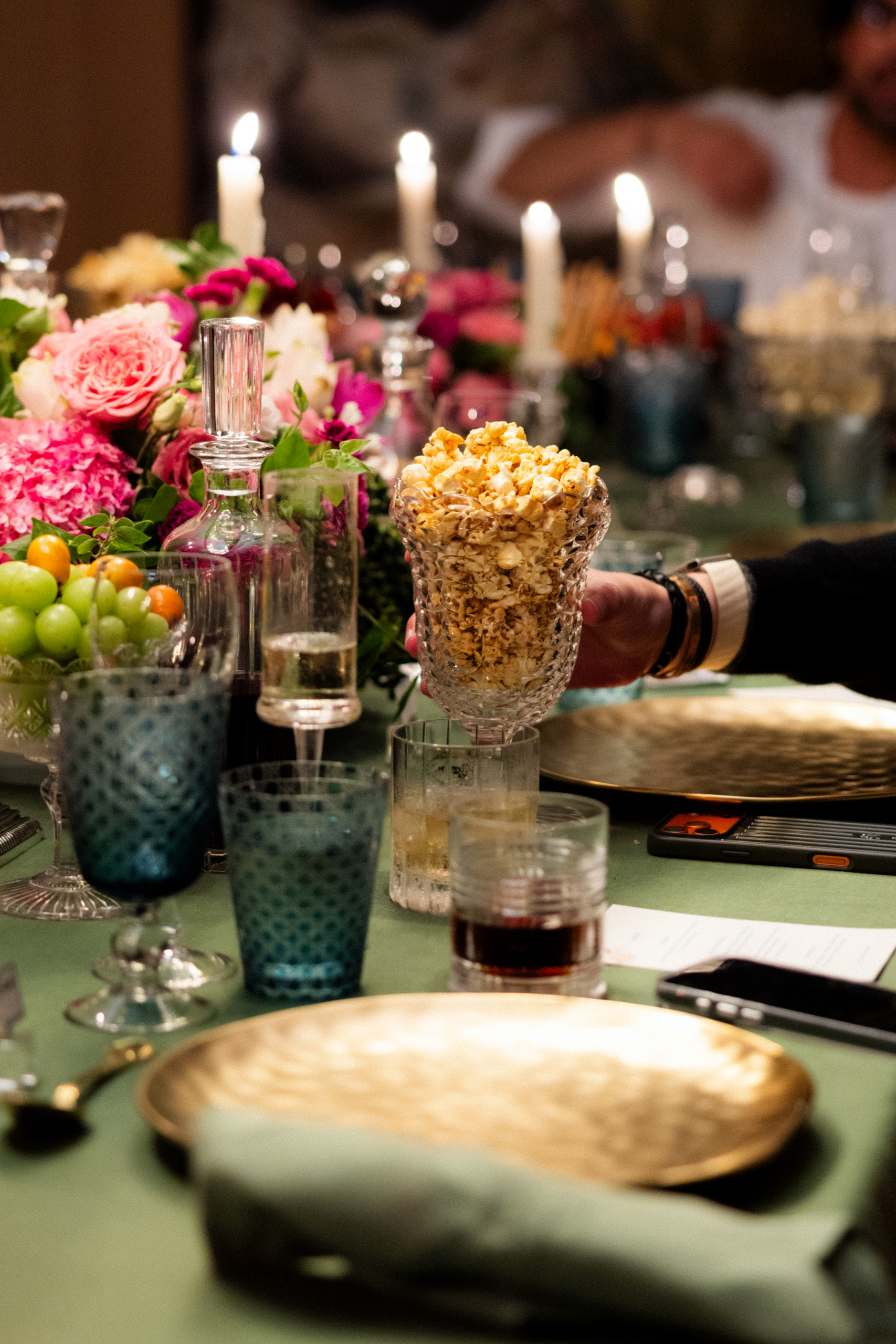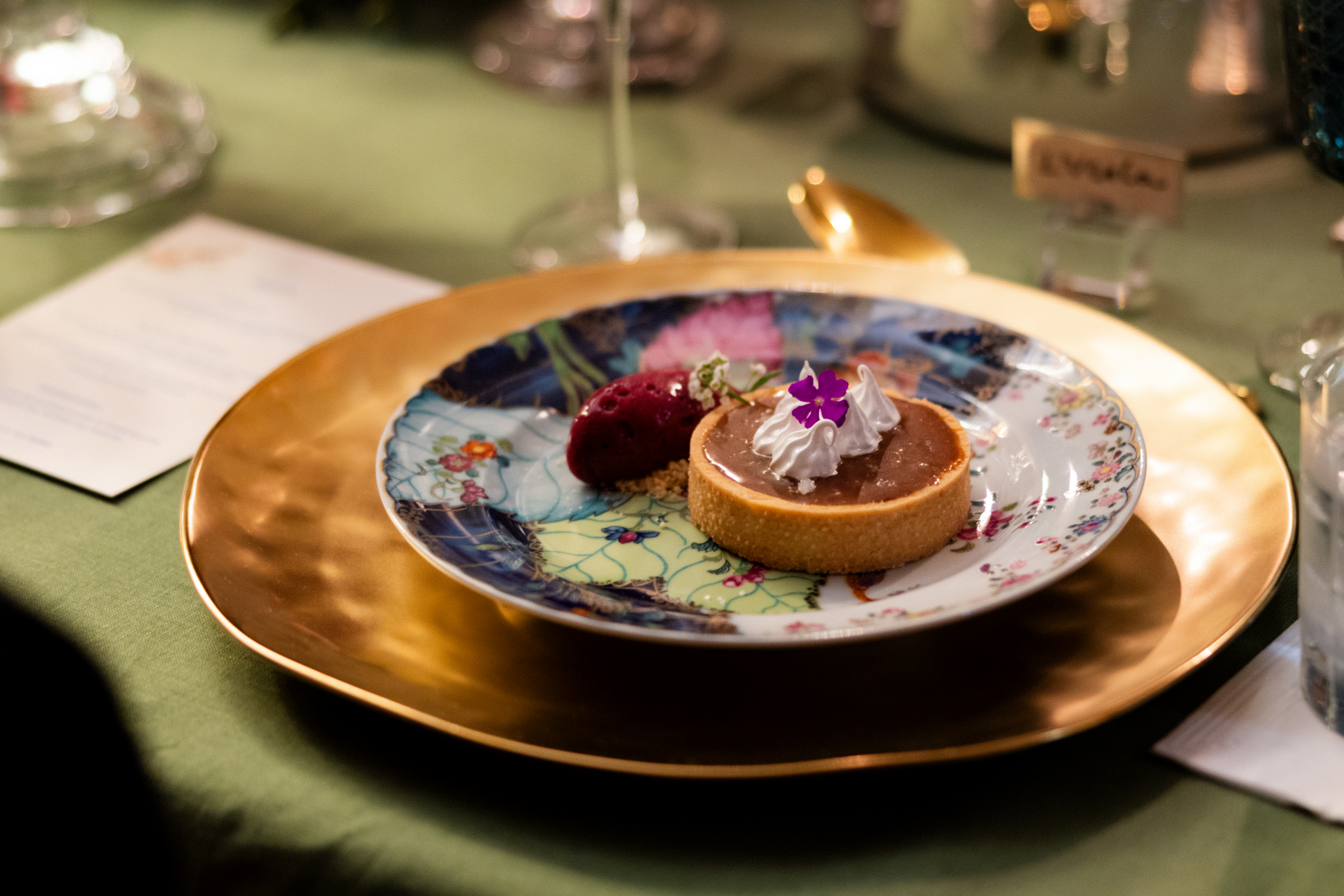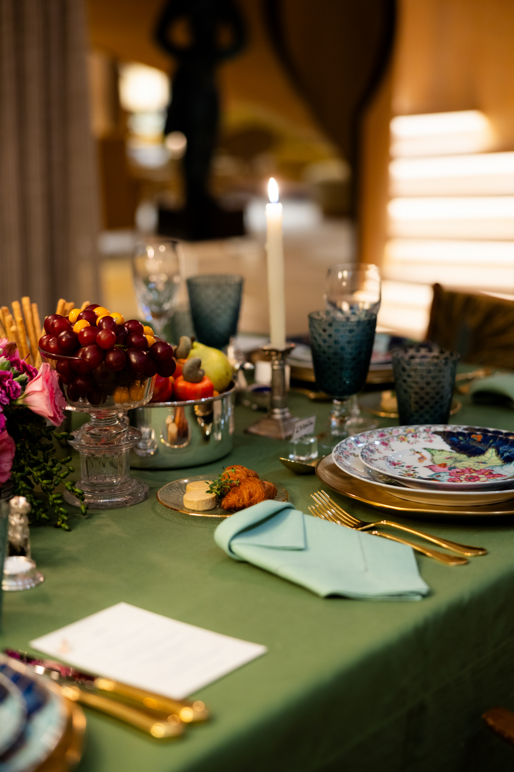 A iluminação, estrategicamente planejada, destacou tanto as peças expostas nas paredes quanto os pratos servidos, evidenciando a integração entre design de interiores e experiência sensorial. Cada elemento da decoração foi pensado para reforçar a atmosfera de elegância e acolhimento, traduzindo a assinatura criativa dos arquitetos.