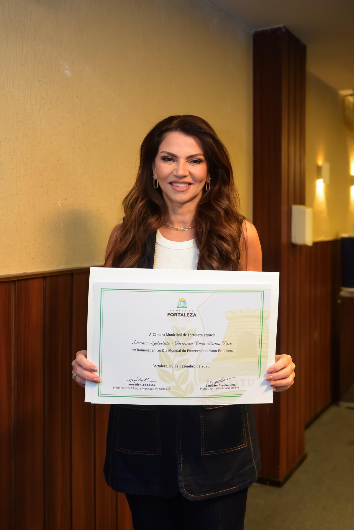 O nome de Surama Geleilate ocupou lugar de honra na noite de segunda-feira (8), durante sessão solene realizada no Auditório Vereador Ademar Arruda, na Câmara Municipal de Fortaleza, dedicada a reconhecer mulheres que têm impulsionado o empreendedorismo em diferentes frentes. A iniciativa, proposta pelo deputado estadual e vereador licenciado Pedro Matos (Avante) e conduzida pelo vereador Wander Alencar (Agir), reuniu representantes de setores diversos em sintonia com as celebrações do Dia Mundial do Empreendedorismo Feminino, instituído pela ONU para destacar a força econômica e social das mulheres.