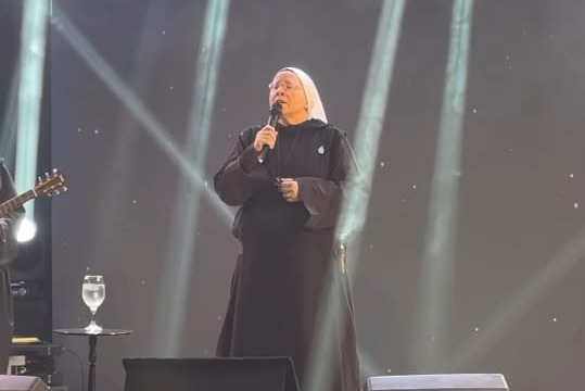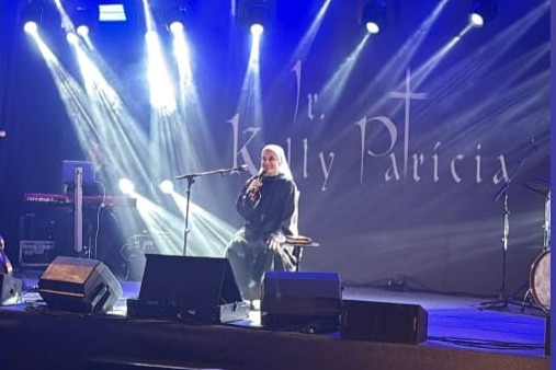 No palco, a cantora Irmã Kelly Patrícia emocionou o público com sua performance — um momento que uniu silêncio atento e sensibilidade coletiva. A apresentação, marcada por canções de espiritualidade e mensagens de esperança, guiou o clima devocional da noite. Ao longo do encontro, Talyzie também expressou seu carinho pela Irmã Maria Raquel, chamada por ela de “instrumento de Deus em nossas vidas”, reforçando vínculos construídos com afeto e admiração. Uma noite que celebrou fé, amizade e a presença inspiradora das irmãs do Instituto Hesed.