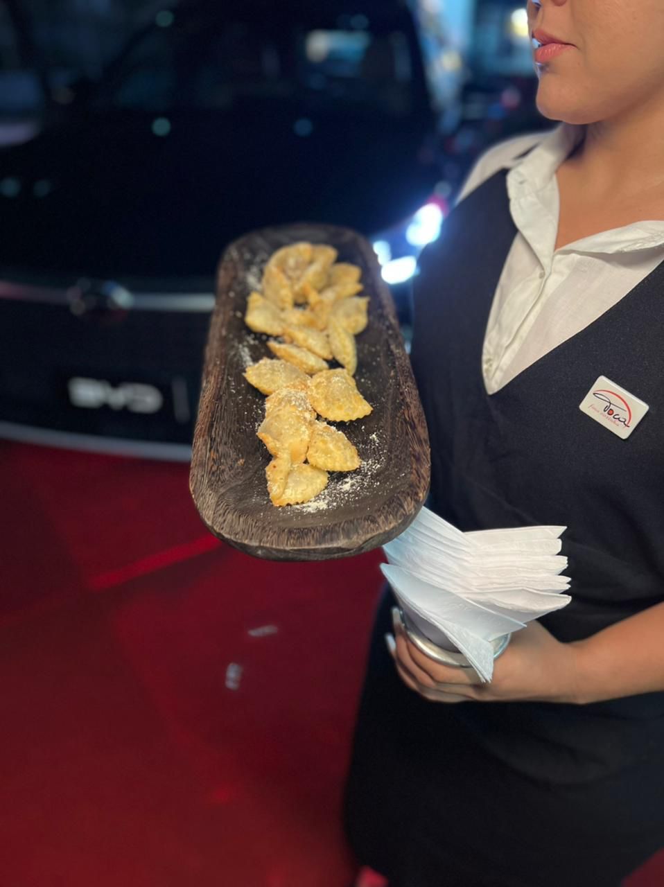 A Toca Fina Cozinha elaborou um menu cheio de variedades para a noite de inauguração da nova concessionária “BYD-Carmais”. O buffet possuía mini pastéis de carne salpicados com queijo parmesão, taça red velvet com creme de limão e morangos frescos, shot saladinhas, pérolas de frango cremoso com dip de mostarda antiga e cone crocante com carpaccio.