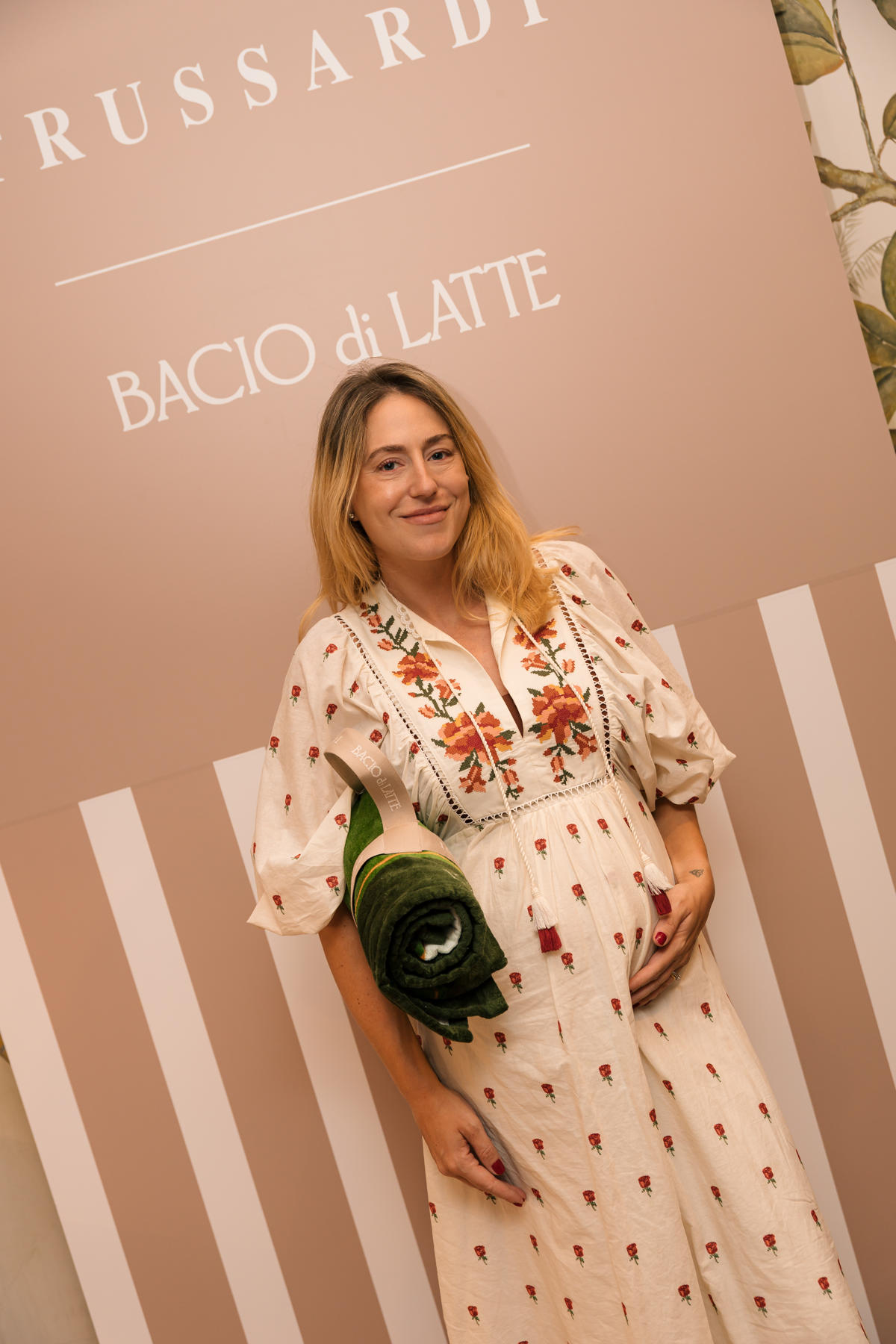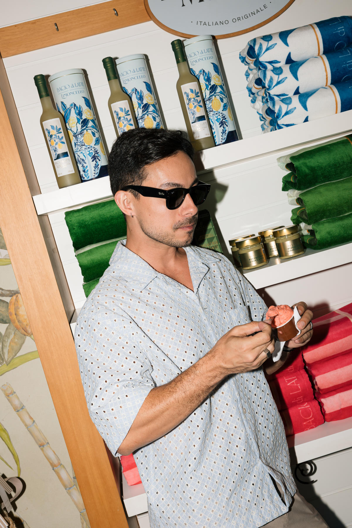 Ju Ferraz entre gelato e as novas toalhas da collab “La Dolce Vita”, durante o lançamento da parceria Trussardi + Bacio di Latte – Créditos: Laura Monticelli