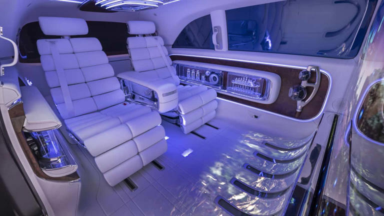 Entre os destaques do conceito está uma impressionante tela 4K de 65 polegadas, que se eleva do chão quando os ocupantes entram na van. O dispositivo faz parte de um sistema multimídia imersivo, que conta com 42 alto-falantes e sete projetores capazes de transformar as janelas em superfícies de exibição adicionais. A proposta da Mercedes é transformar o interior da van em uma sala de cinema com visualização em 360 graus, trazendo uma experiência inédita de entretenimento em movimento.