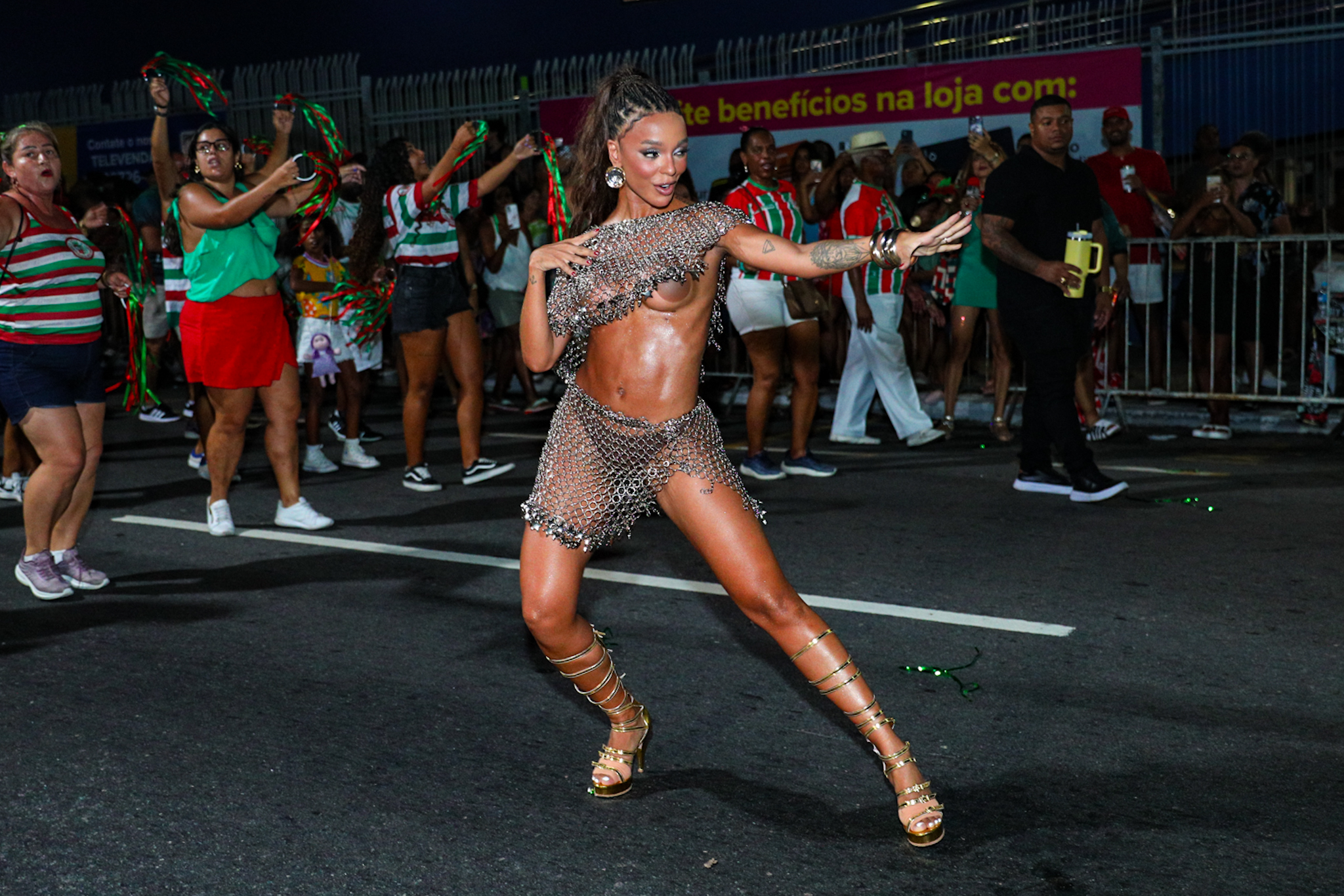 Brunna Gonçalves chamou atenção ao surgir com um figurino vazado, em sintonia com a proposta estética da tricolor para o carnaval 2026. A atriz e dançarina sambou ao lado dos ritmistas, interagiu com o público e manteve presença constante durante todo o ensaio.